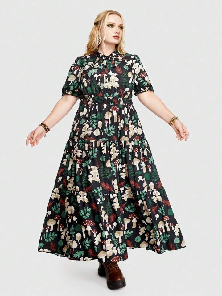 Inna Moreva Plus Size Full Printed High Waist Puff Sleeve Dress