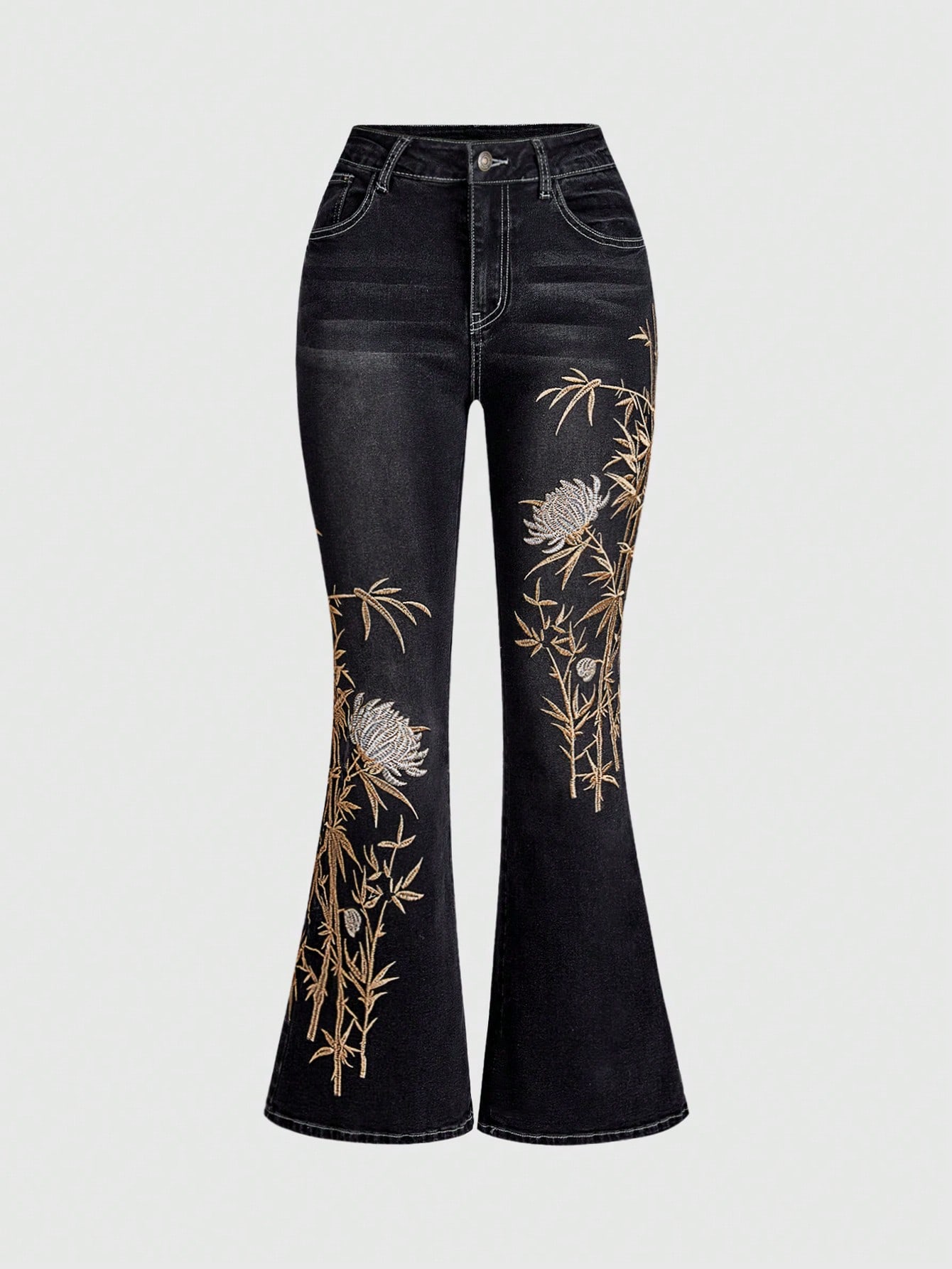 J-FASHION Chinese Style Bamboo Embroidery Women Flared Jeans