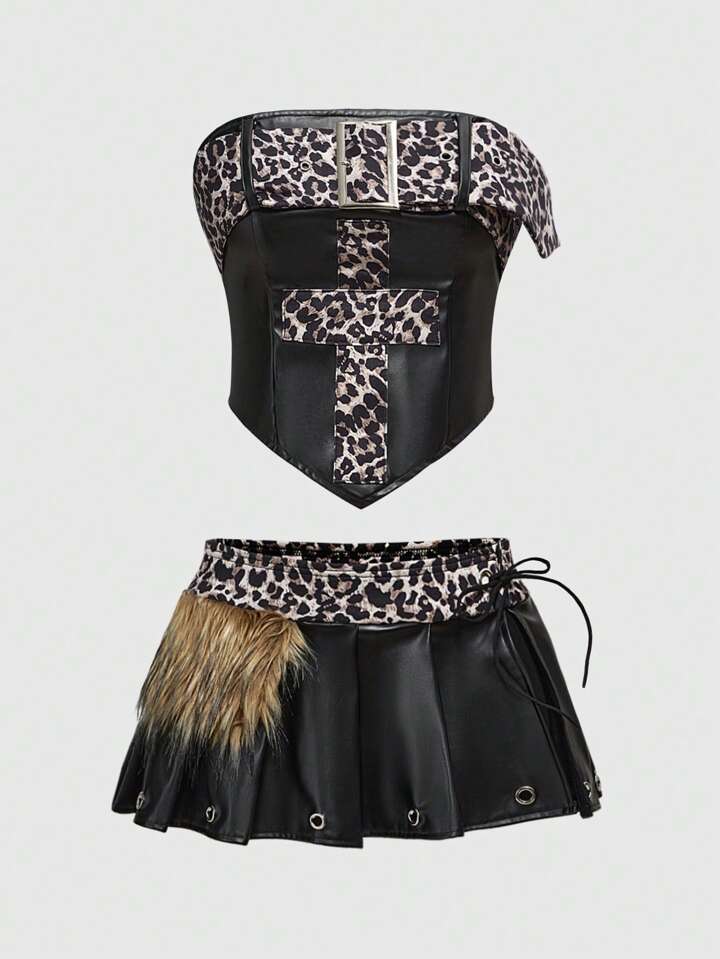 J-Fashion 2pcs Woman's Western Style Y2K Streetwear Leopard & Cross Patchwork Cropped Tube Top & Mini Skirt Cowgirl Outfit