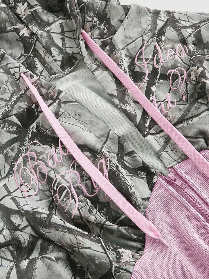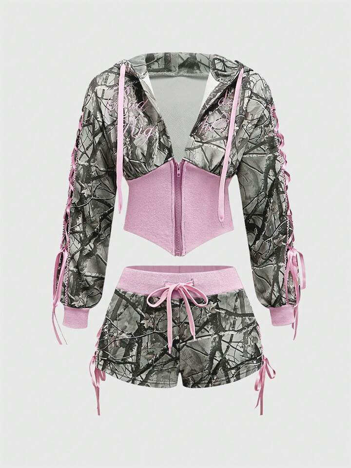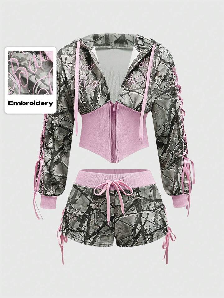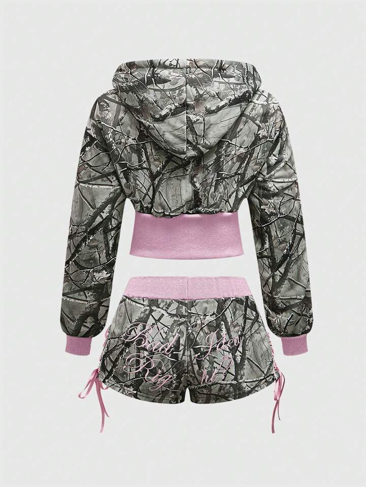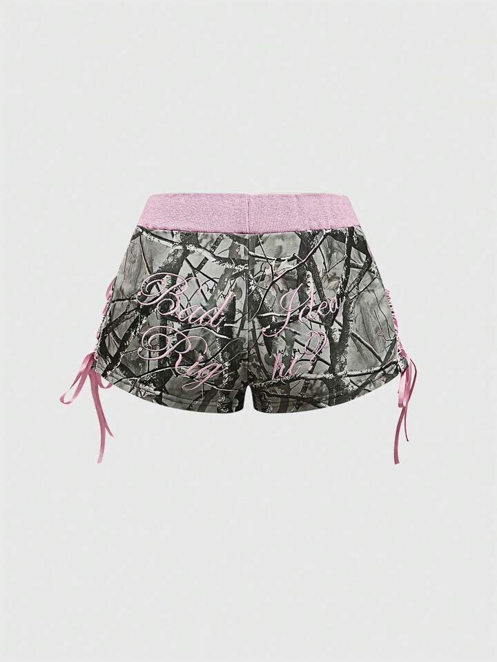 J-Fashion 2pcs Y2K Low Waist Sexy Camouflage Print & Embroidered Text Women's Set