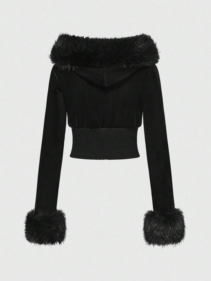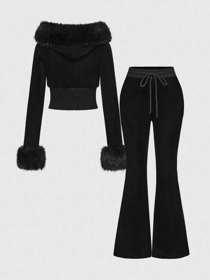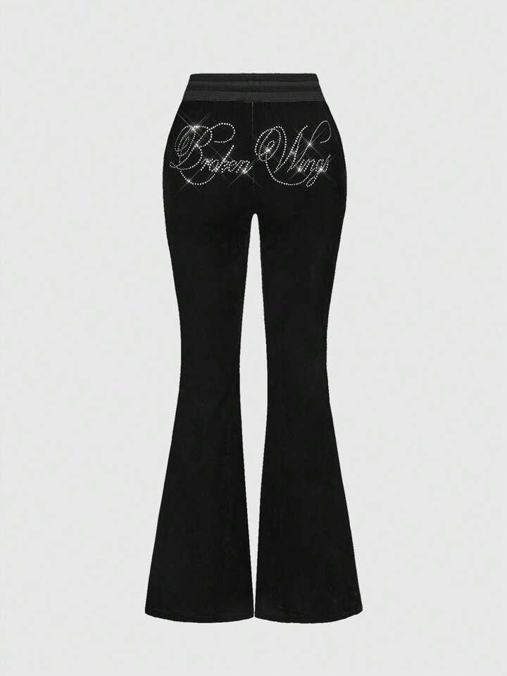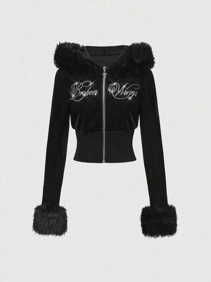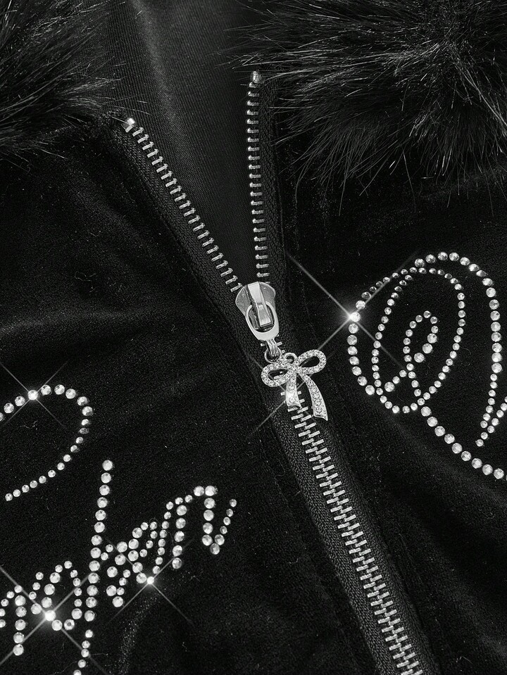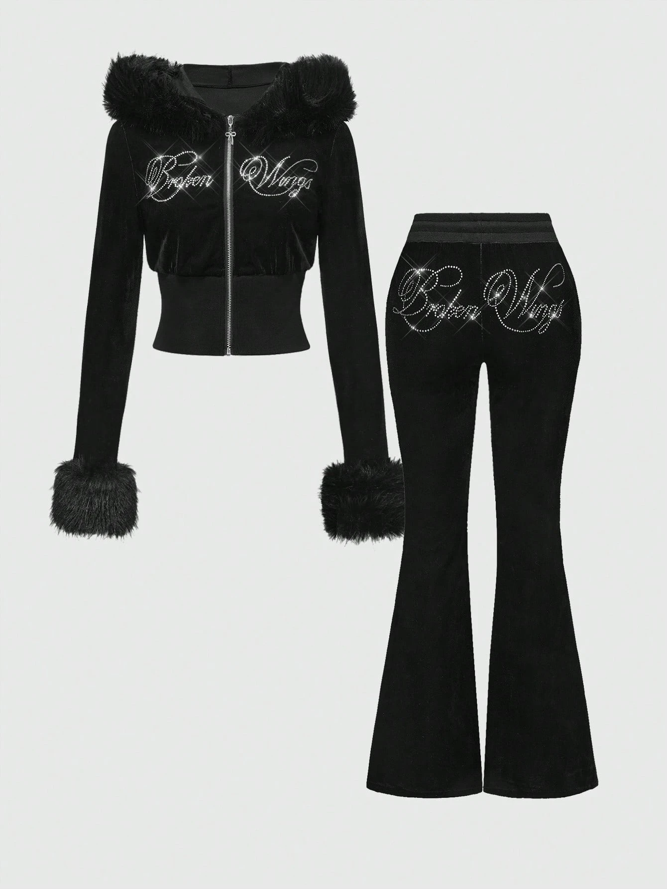 J-Fashion 2pcs Y2K Velvet Rhinestone Embellished Sweatshirt Set For Women, Autumn/Winter