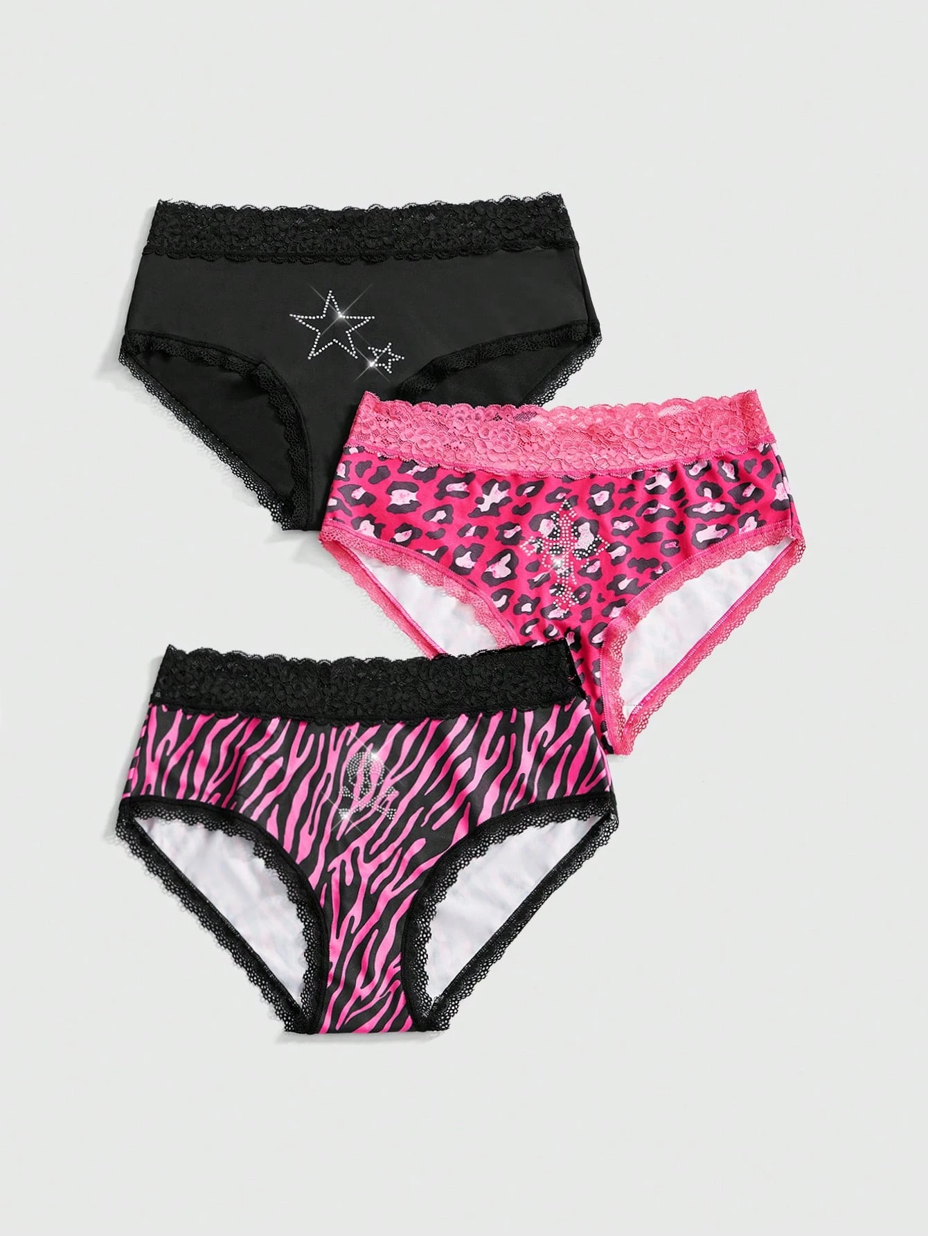 J-Fashion 3pcs Y2K Design Leopard Print, Cross, Pentagram, Skull Rhinestone Lace Splice Women's Thongs Set