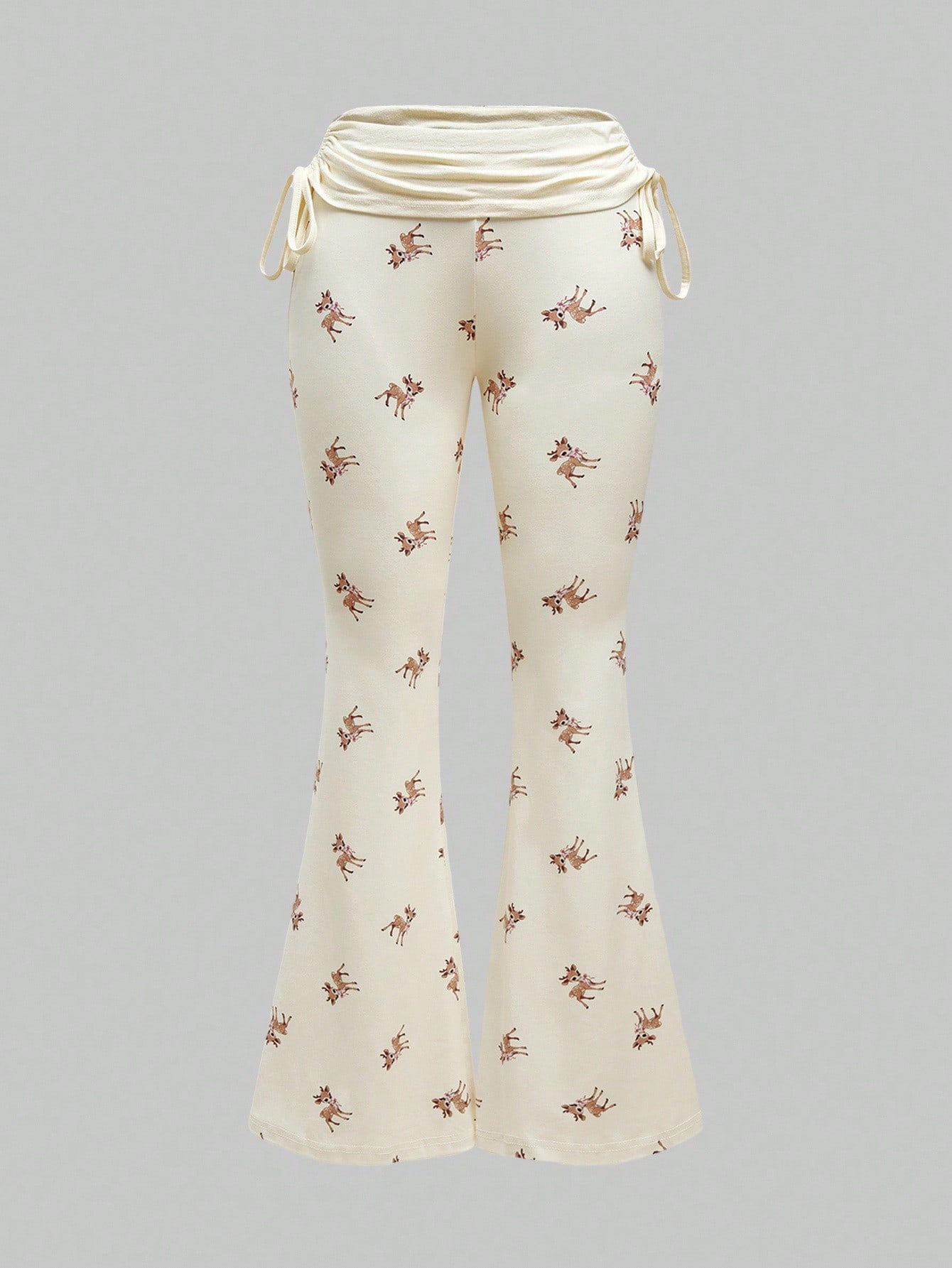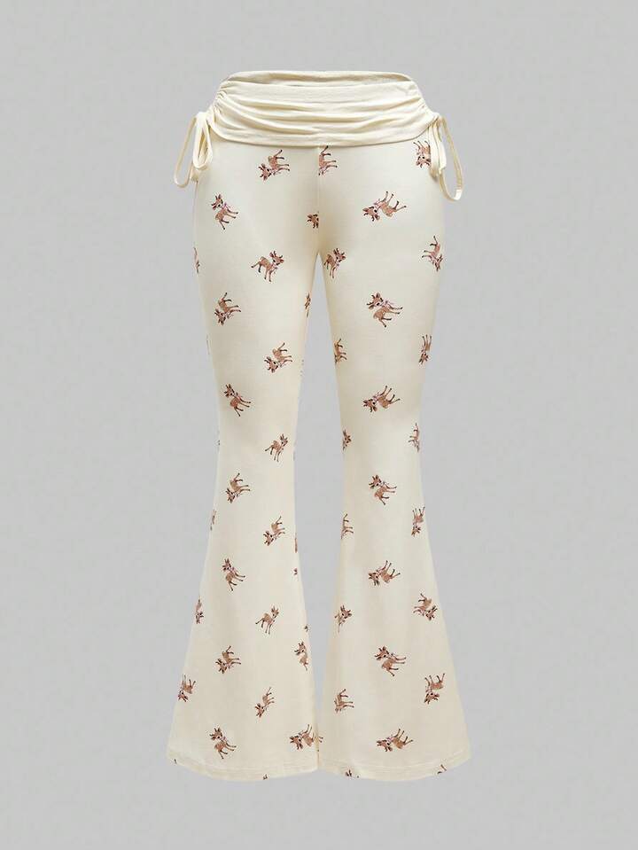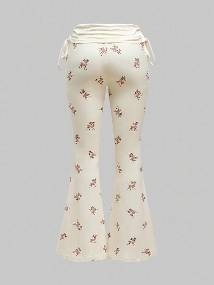 J-Fashion Cute Deer Embroidered Lace Blouse Paired With Deer All-Over Print Flare Pants