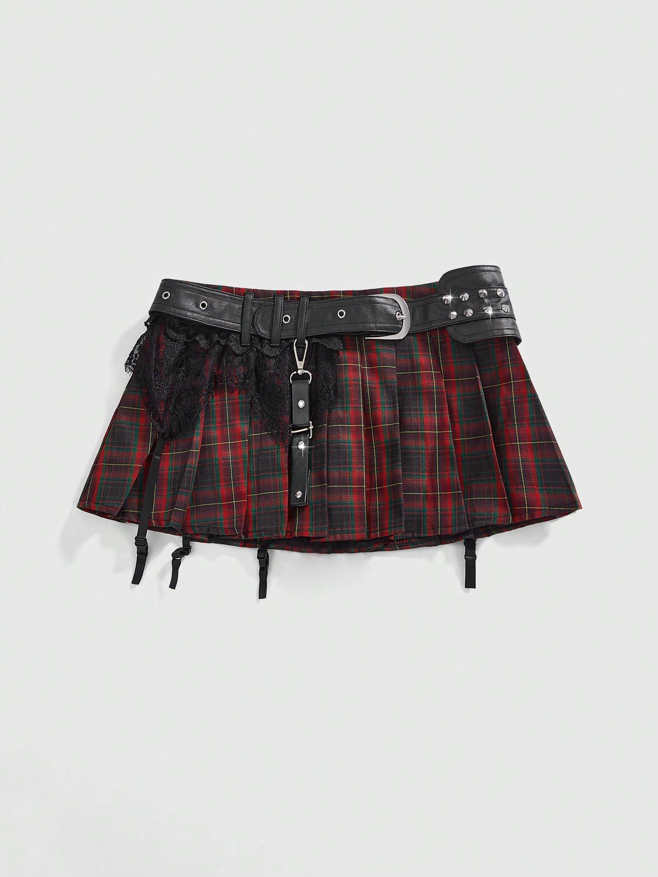 J-Fashion Kpop Halloween PUNK Plaid Dark Sexy Lace Patchwork 2 In 1 Low Waist Super Short Pleated Skirt
