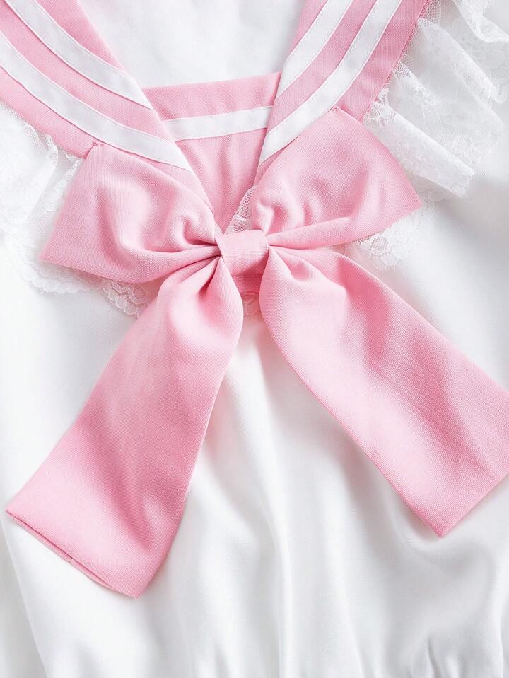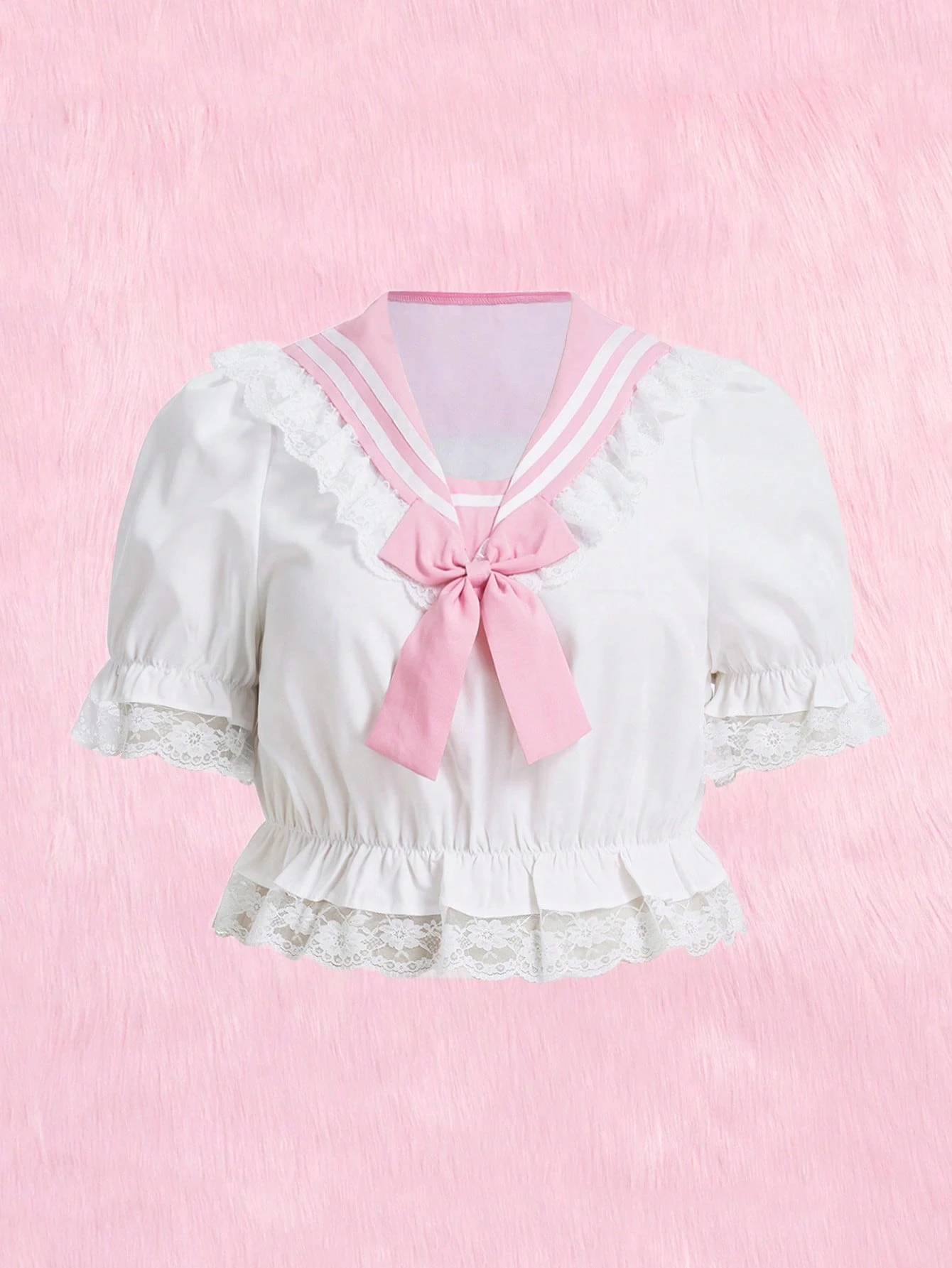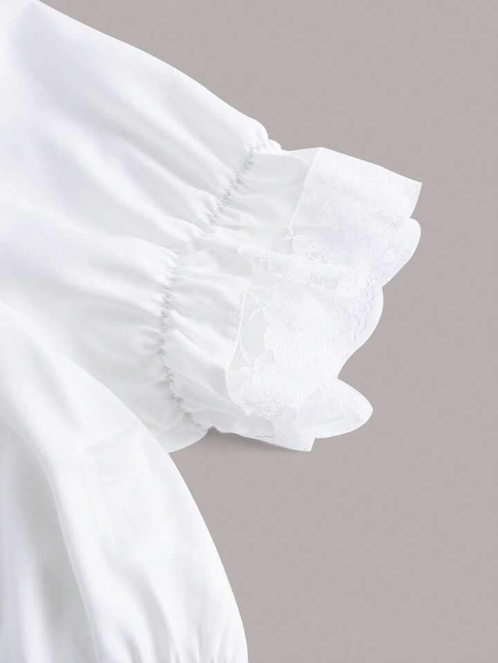 J-Fashion Plus Contrast Lace Bow Front Puff Sleeve Blouse