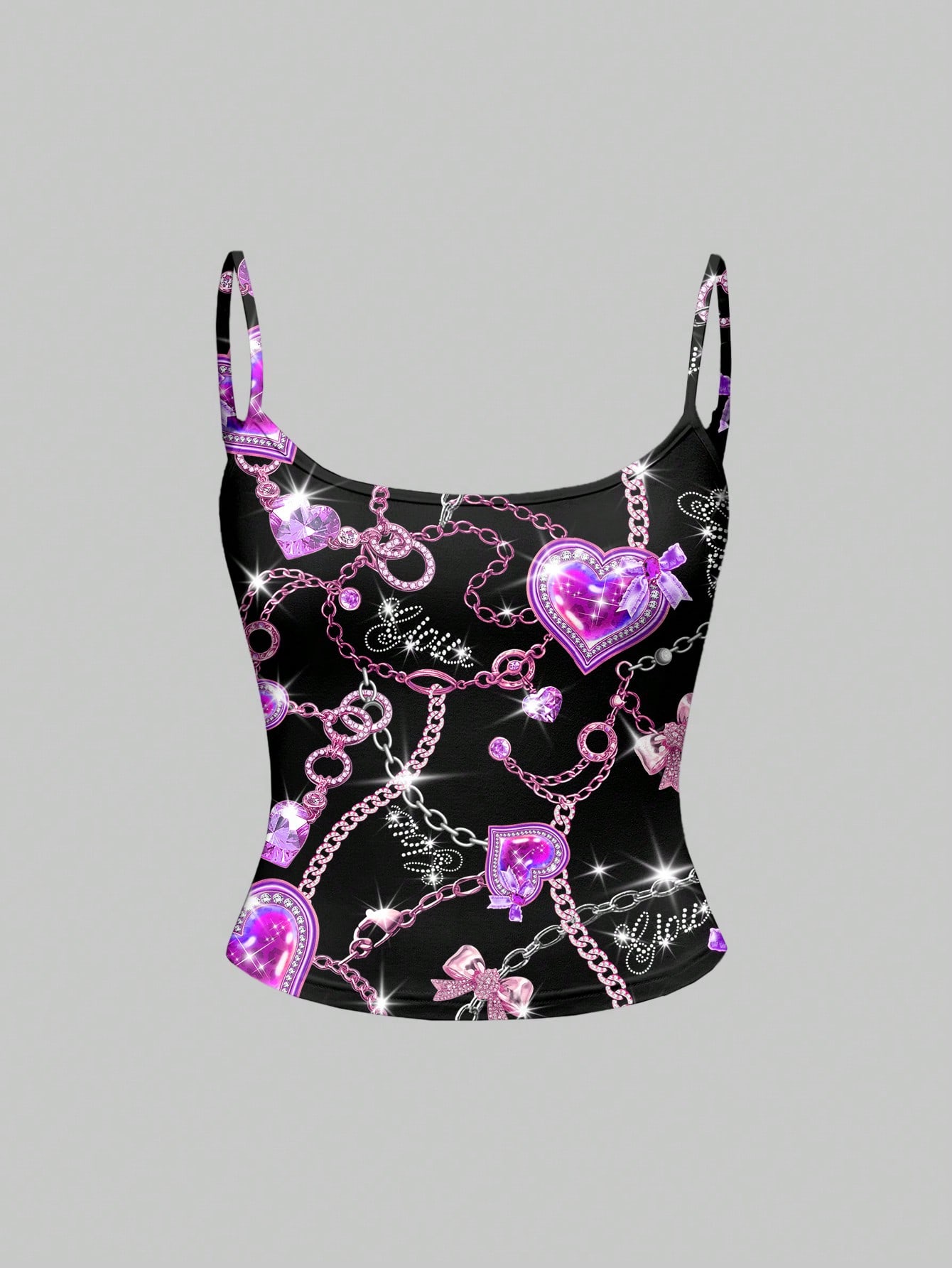 J-Fashion Plus Size Women Sexy Cute Summer Chain & Heart Shaped Rhinestone Embellished Lettering Sleeveless Tank Top