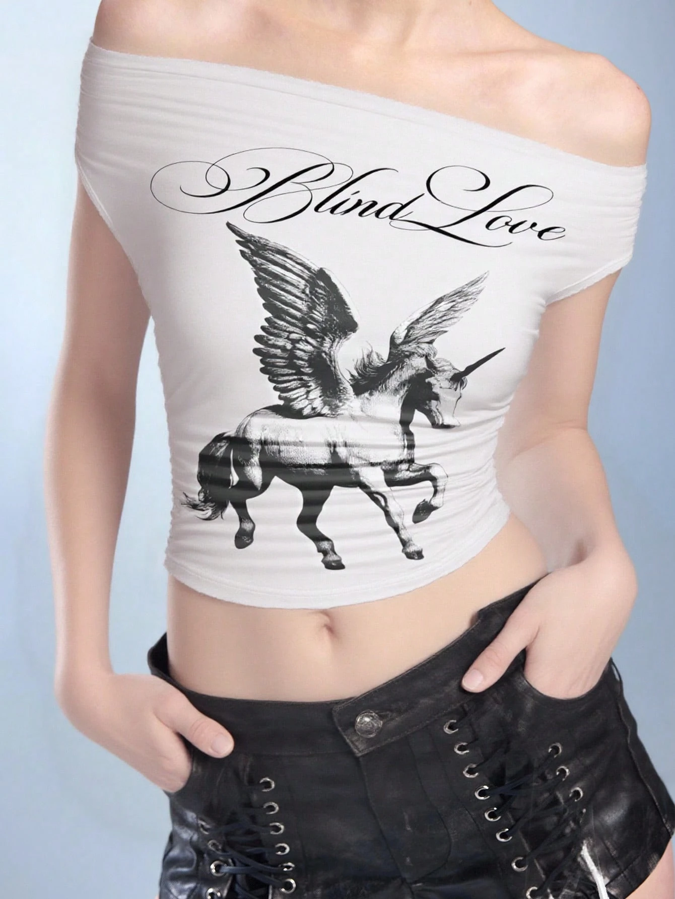 J-Fashion Sexy Asymmetrical Shoulder Music Festival Year Of The Horse Animal Slogan Y2K Short Sleeve T-Shirt For Women, Summer