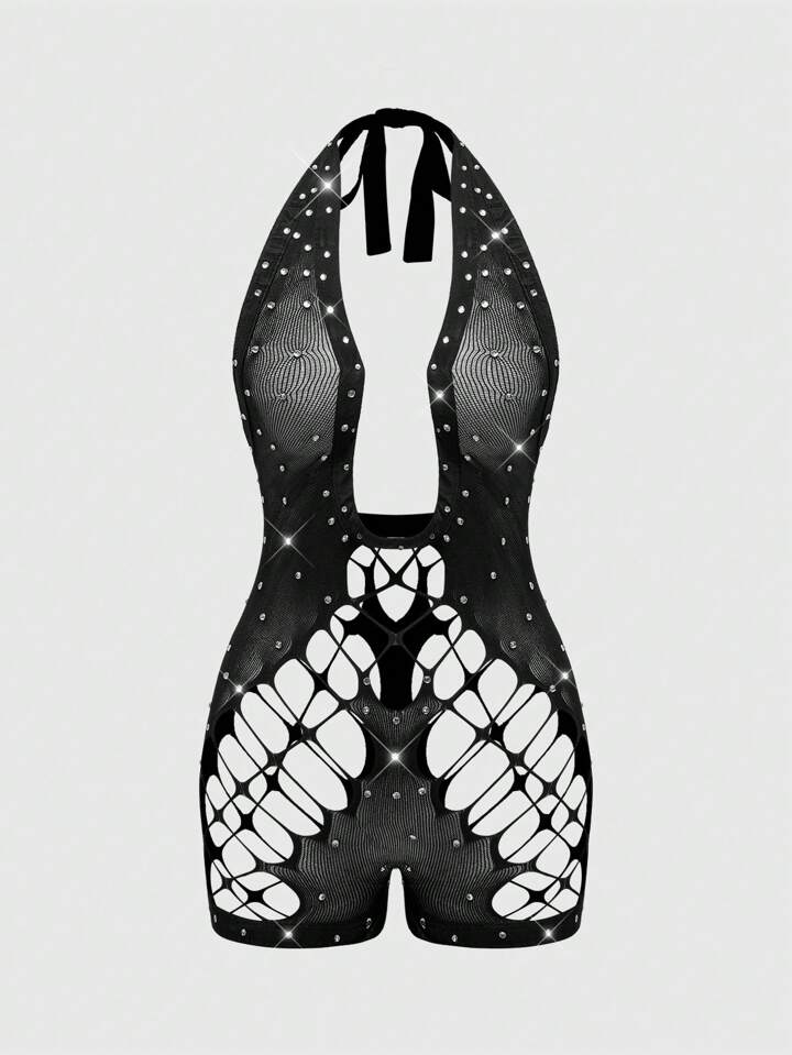 J-Fashion Sexy Y2K Nightclub Party Valentine's Day Glitter Rhinestone Decor Elastic Sheer Jumpsuit For Women, Rave