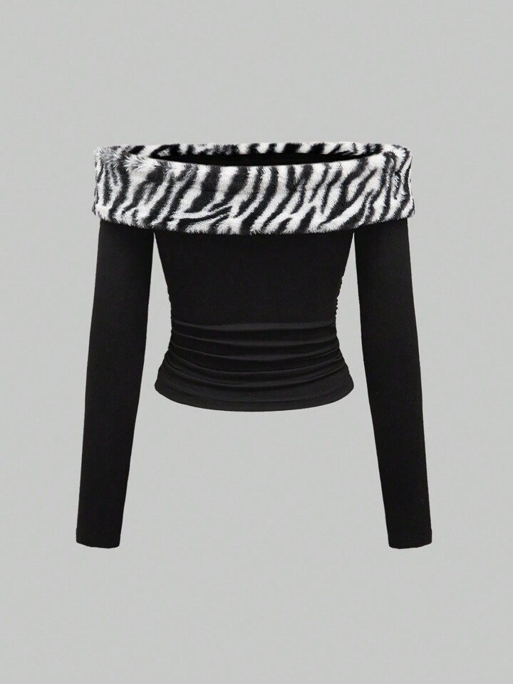 J-Fashion Shibuya Subculture Mohair Blend Zebra Pattern Patchwork Knit Black Fitted Women's Gyaru Off Shoulder Top