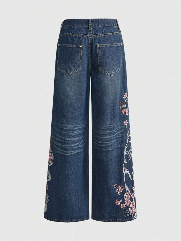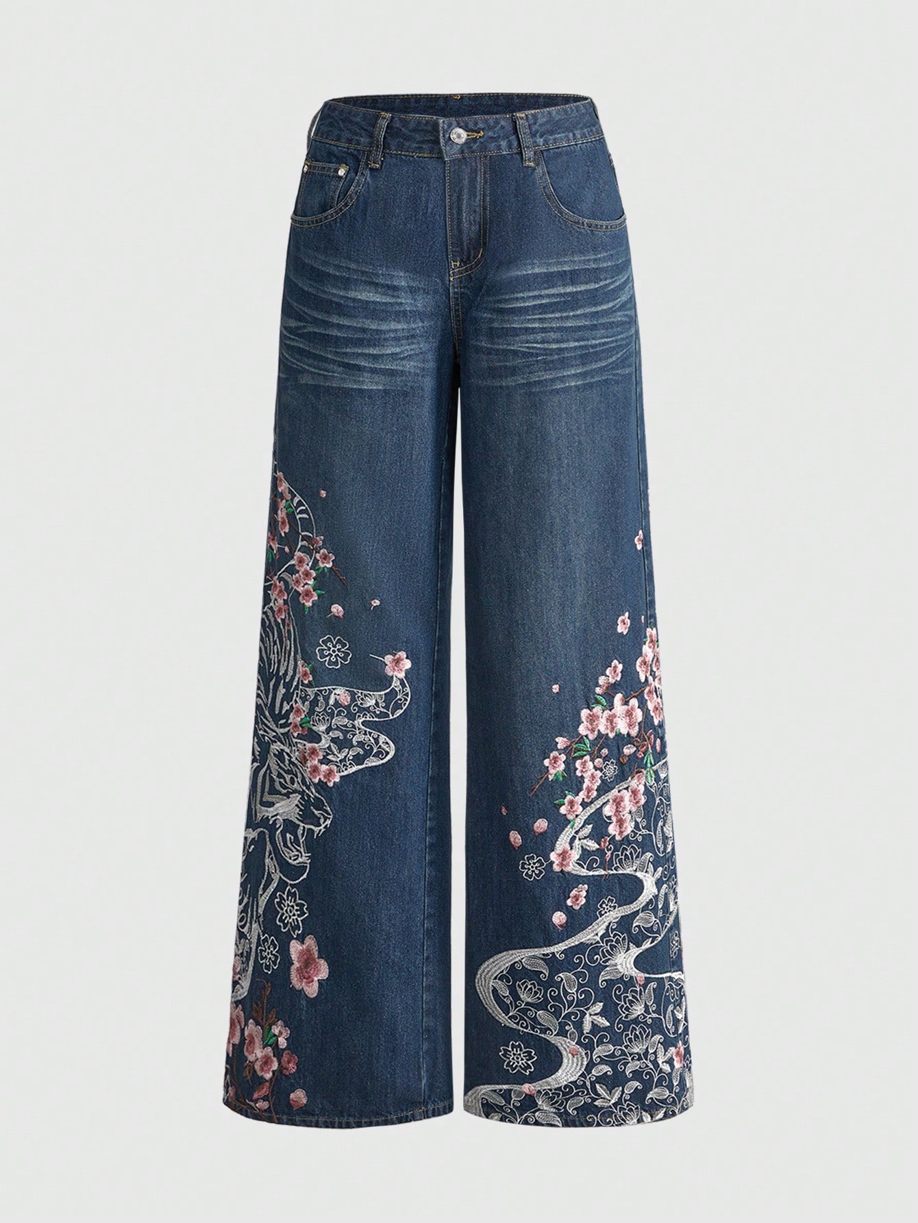 J-Fashion Unisex Retro Street-Style Chinese Tiger & Floral Embroidery Loose Wide-Leg Jeans