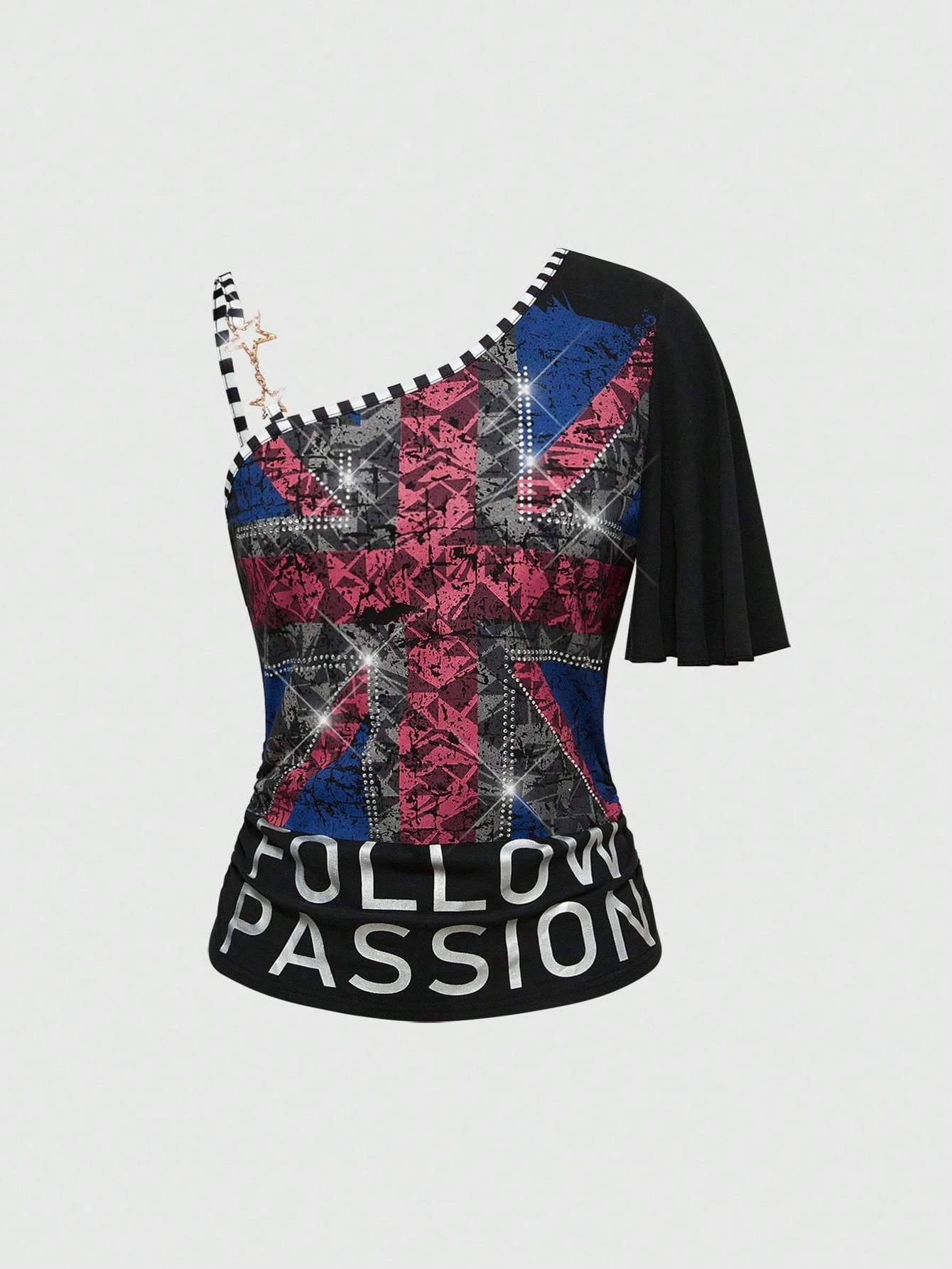 J-Fashion Vintage Cross Rhinestone & Foil Print Ruched Waist Retro Colorblock Black White Striped Trim Gold Star Shoulder Strap Asymmetric T-Shirt