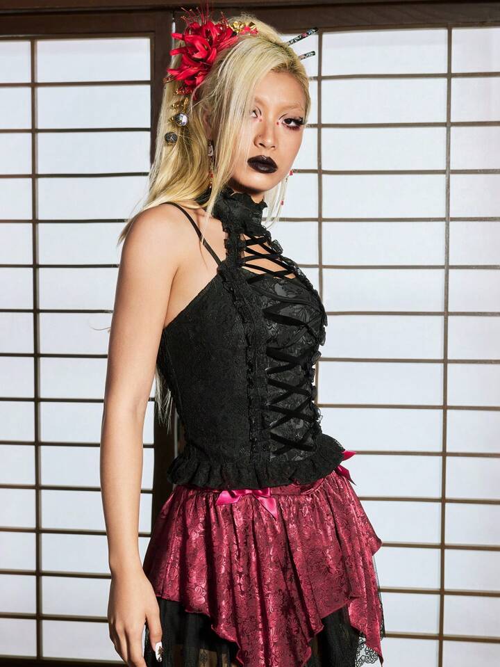 J-Fashion Vintage Lolita Lace Patchwork Stand Collar Crisscross Strappy Tank Top