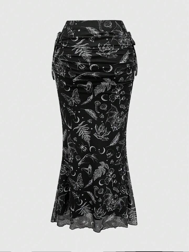 J-Fashion Vintage Moth & Butterfly Print Drawstring Ruched Skirt