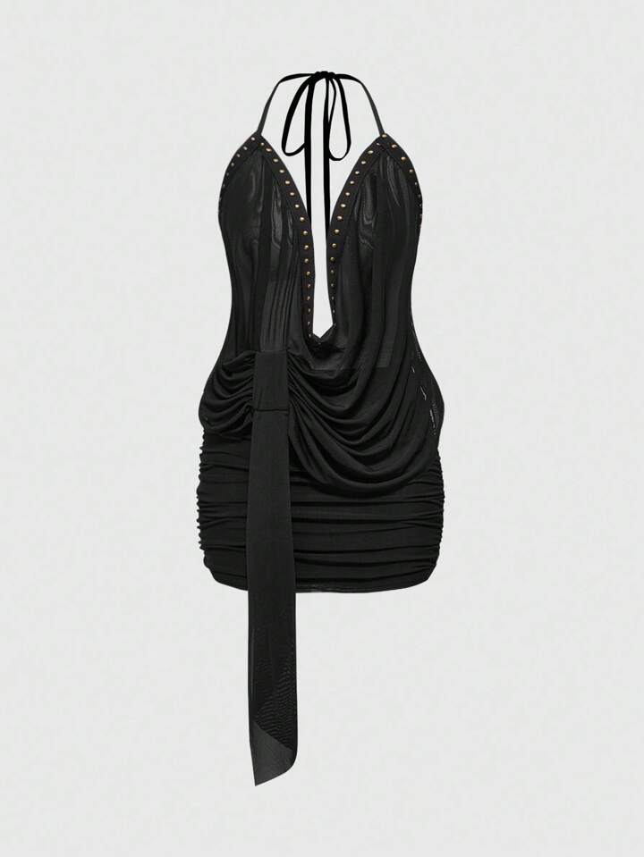 J-Fashion Women's Retro Y2K Music Festival Beaded Ribbon Decor Halter Tight Fitted Sheer Mini Dress