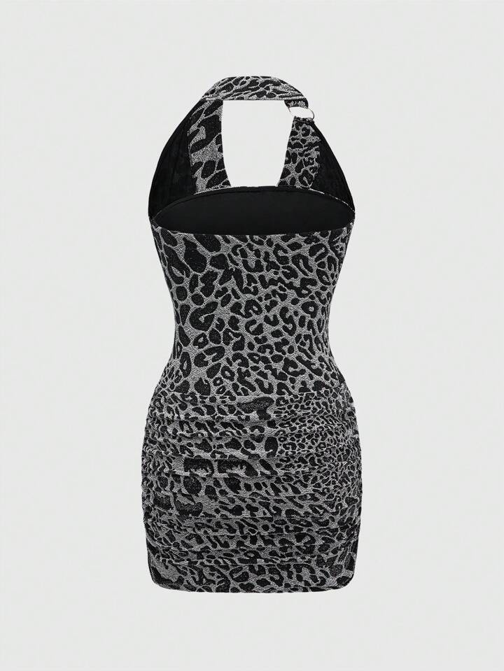 J-Fashion Y2K Leopard Print Plunge Neck Metal Ring Design Textured Metallic Bodycon Mini Party Dress For Women