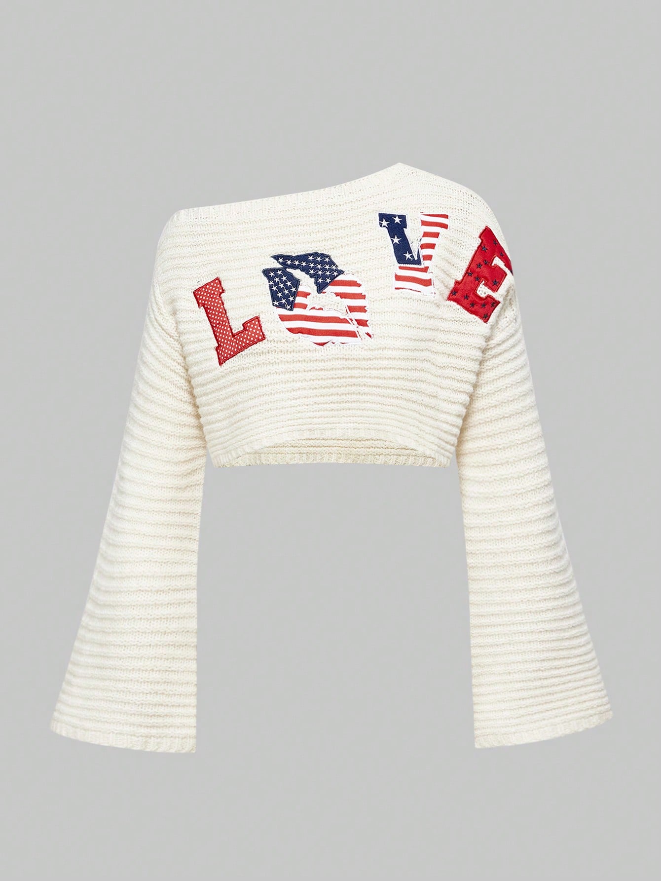 J-Fashion Y2K Slogan English Love Graphic Oblique Shoulder Flared Sleeve Knitted Sweater