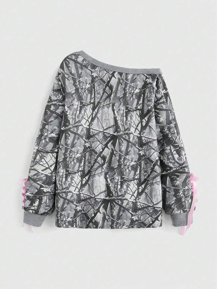 J-Fashion Y2K Style Camo Print Embroidered Bow Decor White Ribbon Women Hoodie