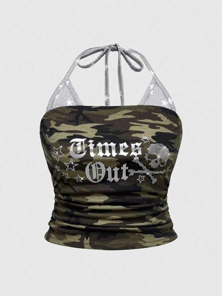 J-Fashion Y2K Style Plus Size Spaghetti Strap Skeleton Rhinestone Gothic Print Camisole And Tank Top Set, Plus Size