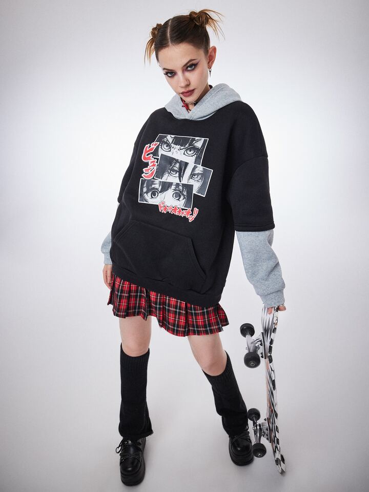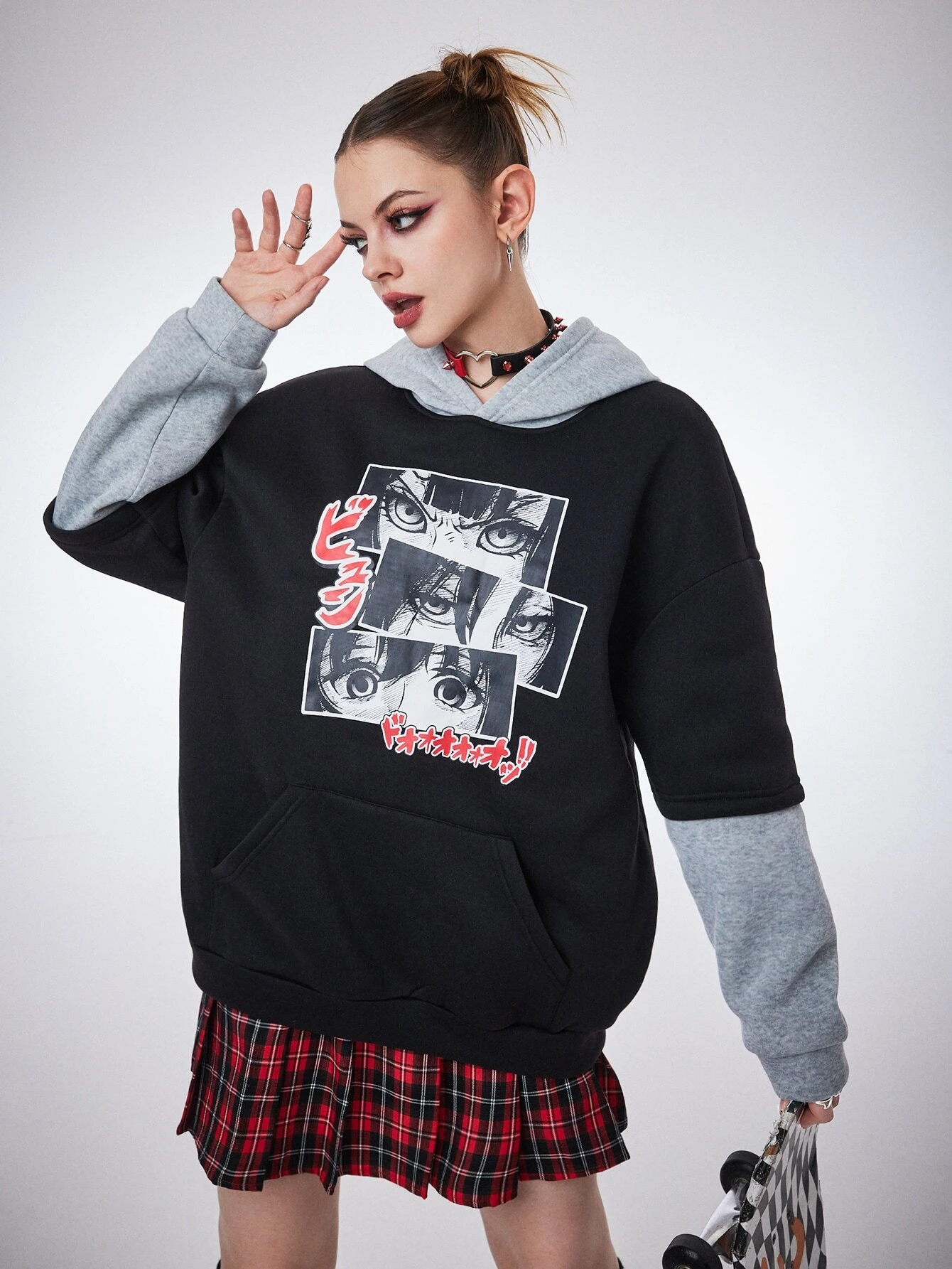 Japanese Writing Figure Graphic Kangaroo Pocket Drop Shoulder Hoodie