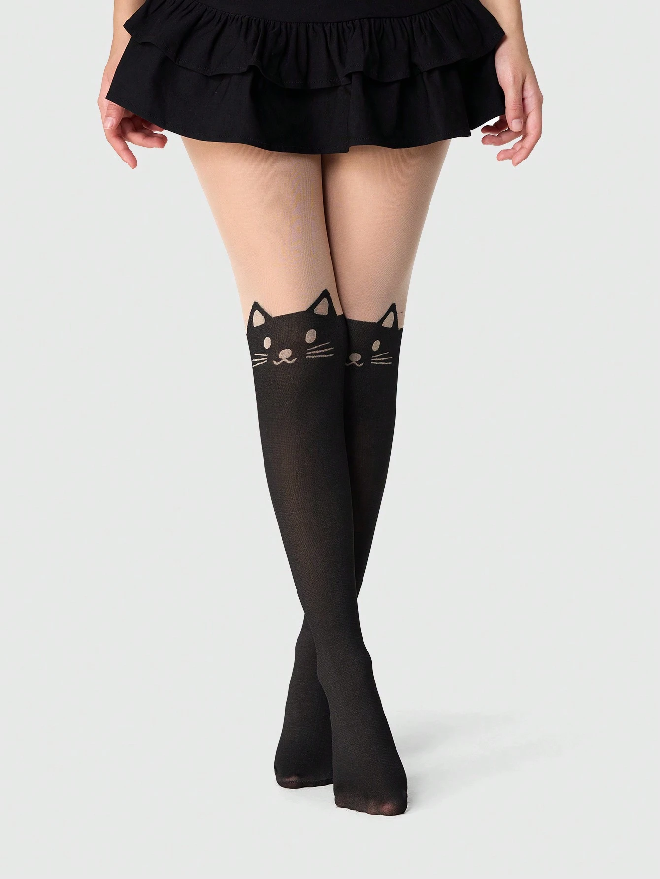 Kawaii 1 Pair Black Cat Print Pantyhose, Cute Sheer Tights With Elastic, Slimming Effect, Thin Skin-Tone And Black Contrast
