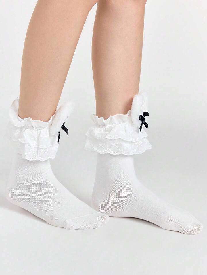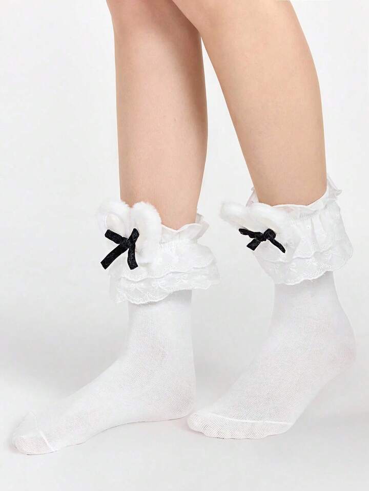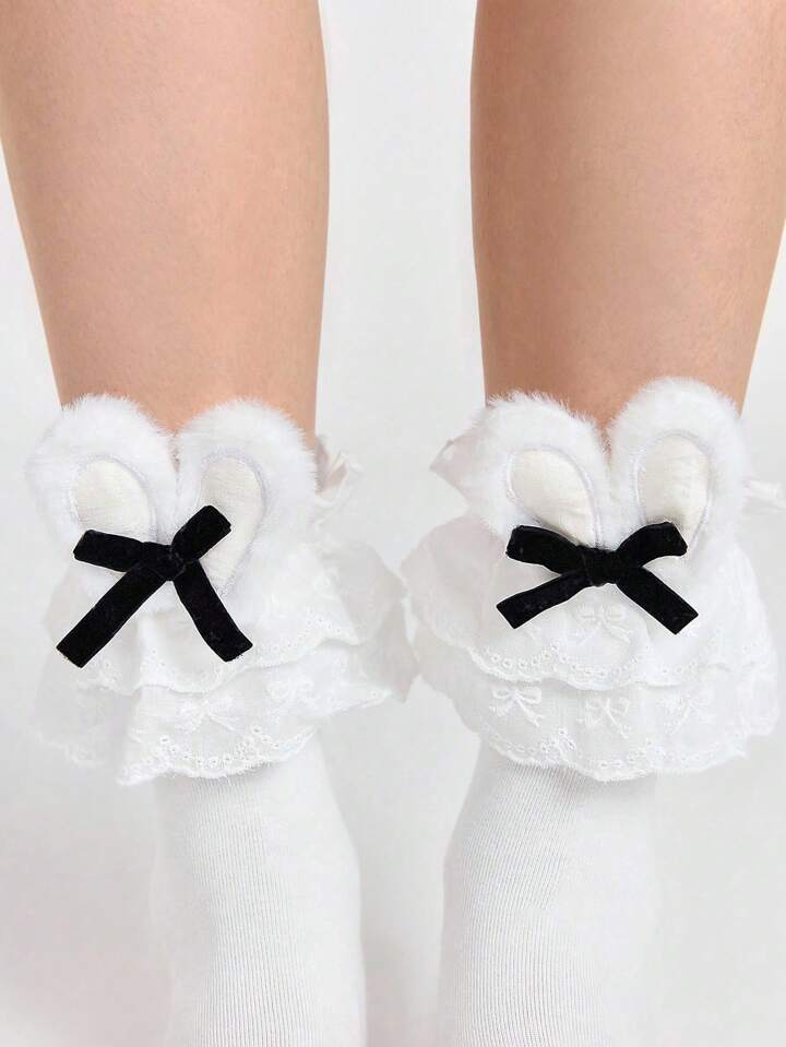 Kawaii 1 Pair Cute Fluffy Rabbit Ear Black Bow Accent Mid-Calf Socks, Multilayer Lace Trim Breathable Short Socks, Sweet Style Daily Versatile JK School Uniform Socks For Women