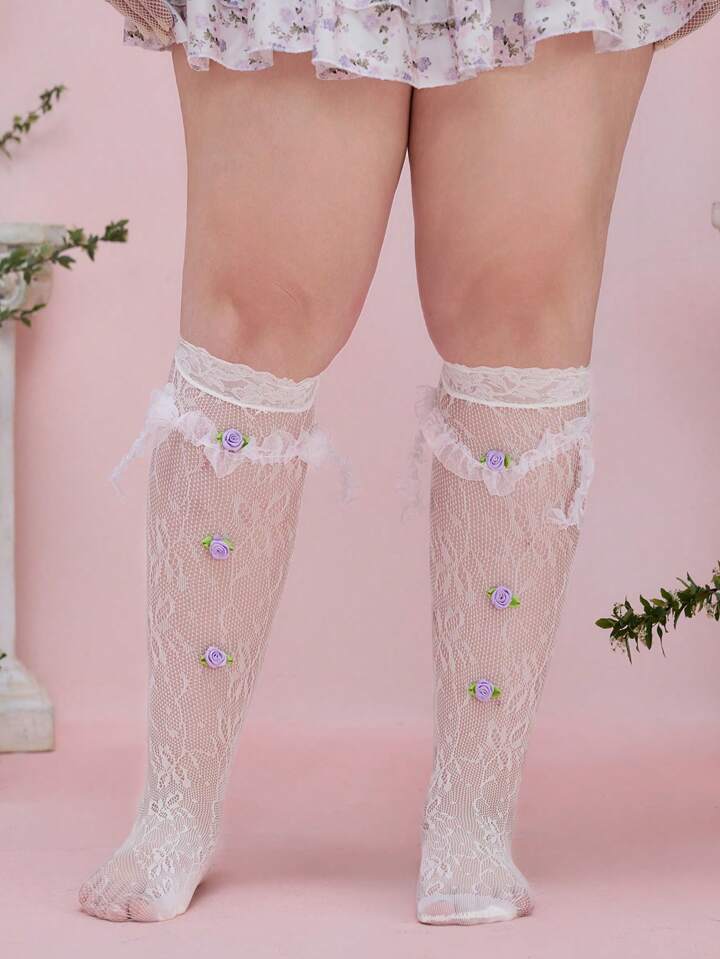 Kawaii 1 Pair Cute Rose Floral Lace Mid-Calf Socks, Vintage Sweet Purple 3D Flower Decor Fishnet Socks, Palace Style Organza Ribbon Women Socks