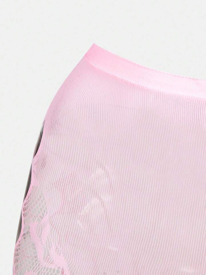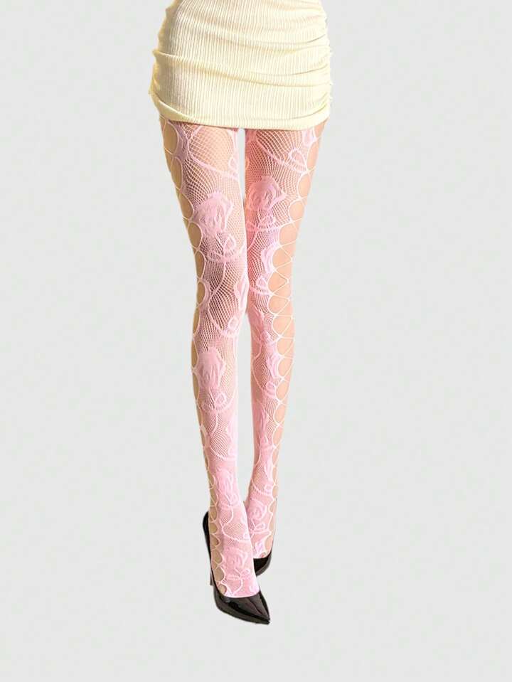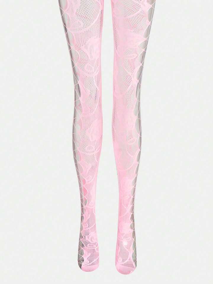Kawaii 1 Pair Fishnet Stockings With Side Grid Cutout, Vintage Sexy Pink Rose Vines Pattern Tights, Ultra-Thin Elastic Sheer Pantyhose