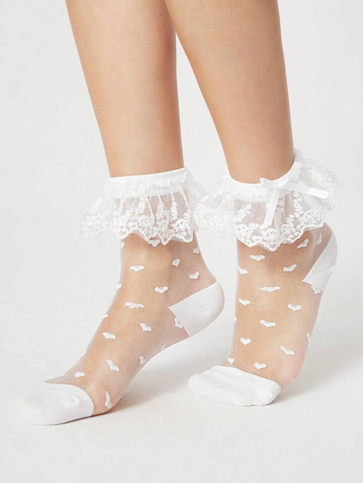Kawaii 1 Pair Women Lace Socks Lolita Style Heart Pattern Mid-Calf Socks Mesh Tulle White Socks, Summer