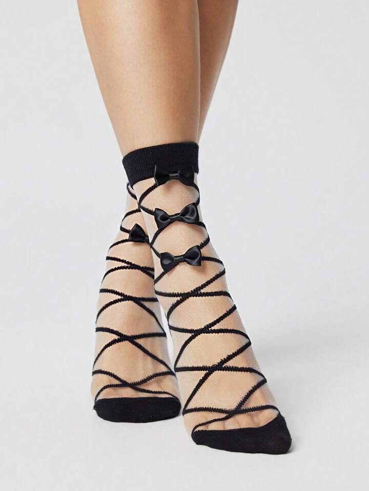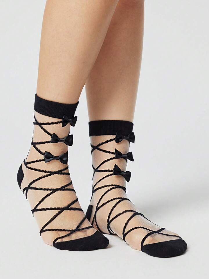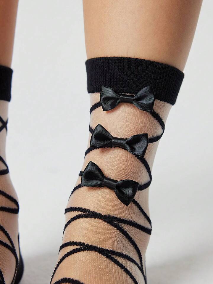 Kawaii 1 Pair Women's Ballet Inspired Black Crossover Rib Bow Decor Mid-Calf Socks, All Season