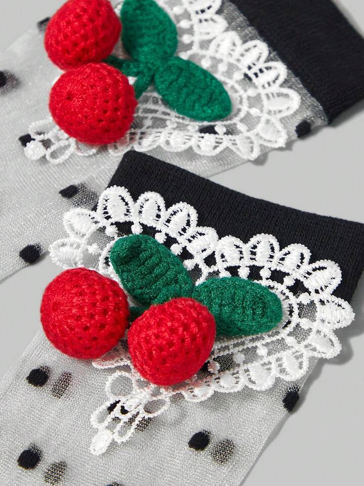 Kawaii 1 Pair Women's Cool Black Cherry Heart Polka Dot Fishnet Mid-Calf Socks, All Season