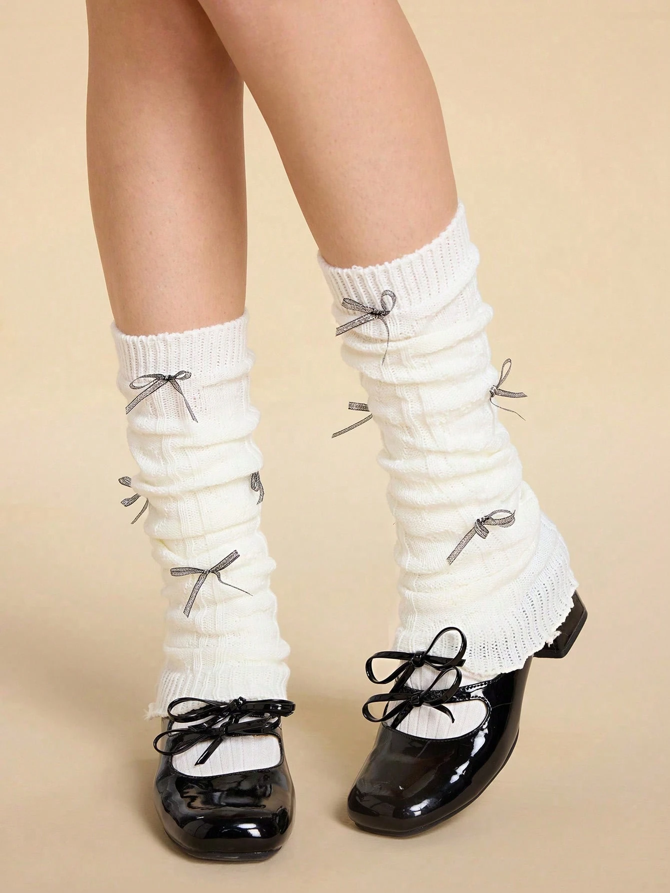 Kawaii 1 Pair Women's Vanilla Girl Theme Shiny Bow Ballet Solid Color Ruffle Leg Warmers, For All Seasons