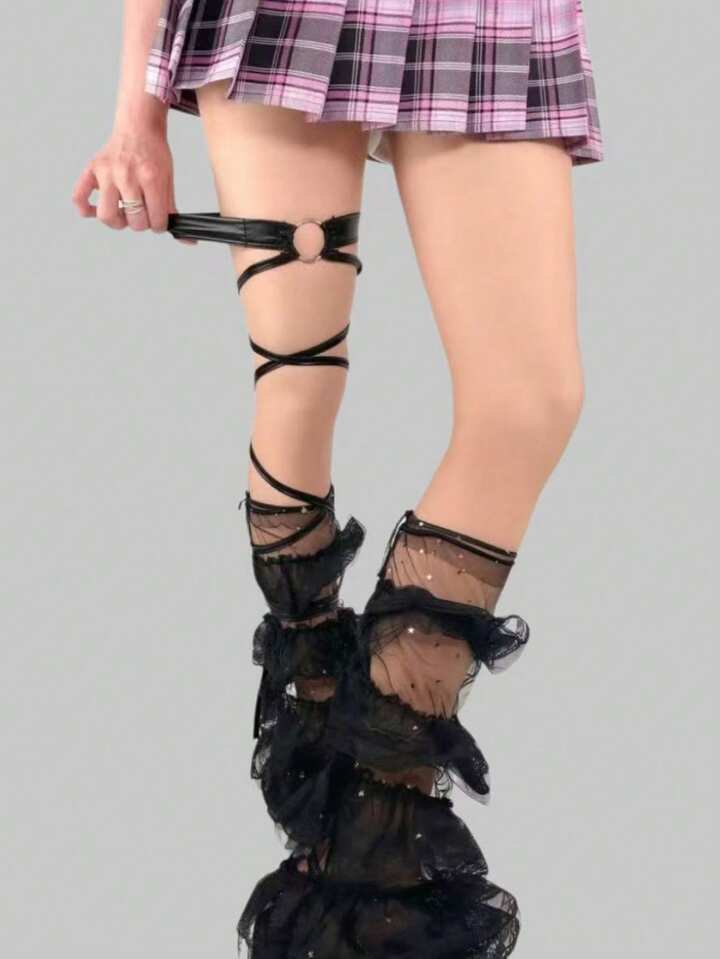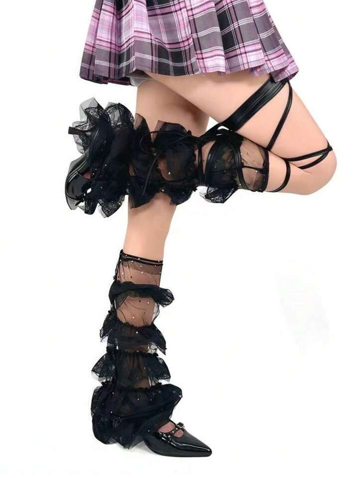 Kawaii 1 Set Of 1 Pair Black Cute Star Leg Warmers + 1 Black Leg Garter Band, For Women
