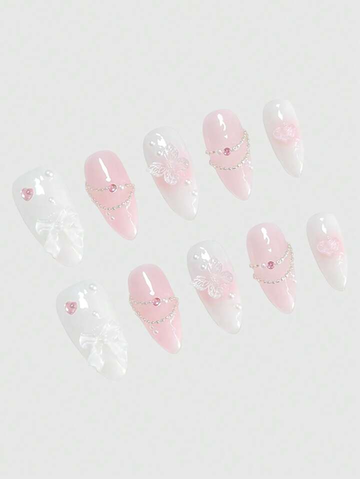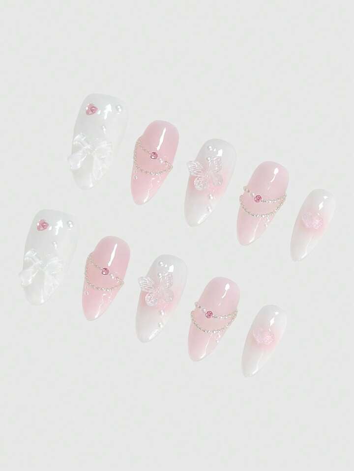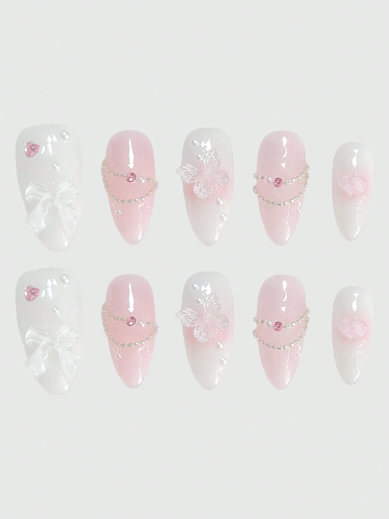 Kawaii 10pcs Cute Crystallized Blush Dot Nail Art Decals With Heart & Butterfly Chains And 1pc Nail Tape