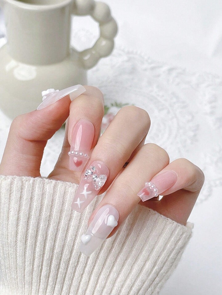 Kawaii 10pcs Handmade Butterfly & Faux Pearl Heart Nail Tips, 1pc Nail Tape, For Valentine's Day