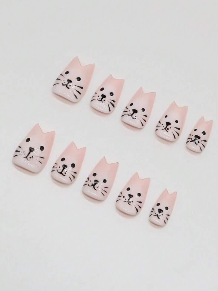 Kawaii 10pcs/Set Handmade High-Quality Cute Cat Element Fake Nails + 3pcs Double-Sided Adhesive, Removable Line Drawing Pink & White Ombre Nail Stickers, Niche Sweet Style Cat Ear Nail Art, Suitable For Holiday Party, Dance And Daily Wear