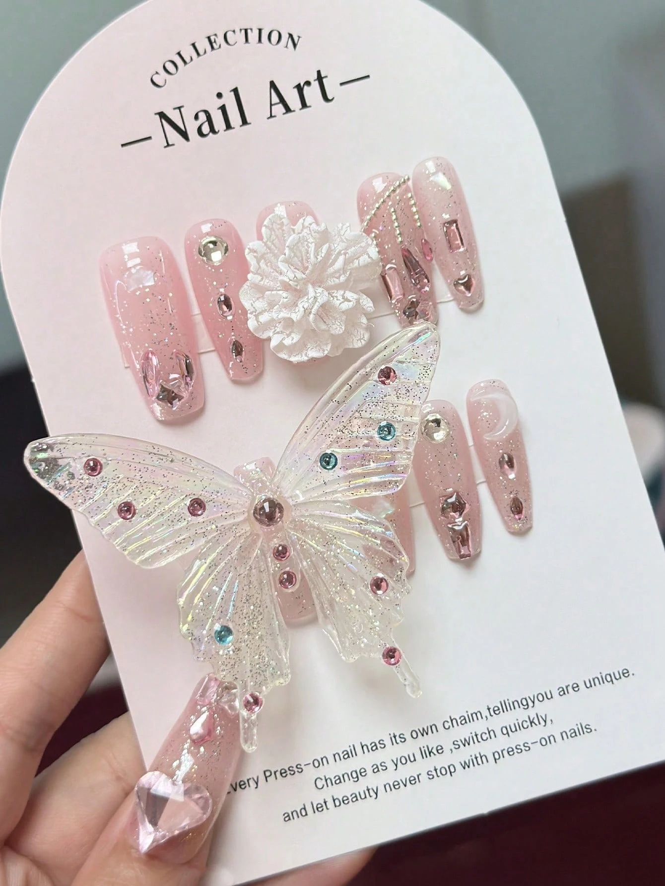 Kawaii 10pcs Super Large Pink Hand-painted Butterfly Nail Art Stickers + 1 Sheet Double-sided Adhesive Tape