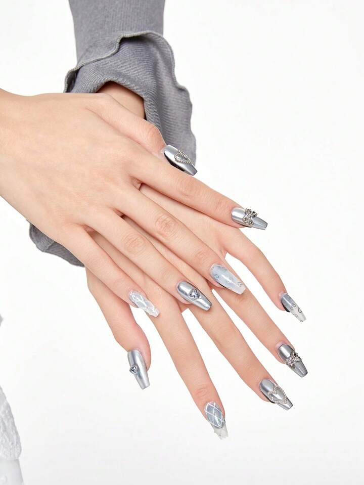 Kawaii 10pcs Sweet And Cool Style Star & Bowknot Handmade False Nails With 3pcs Double-Sided Adhesive, Removable Y2K Silver Hand-Painted Nail Stickers, High-Quality Diamond-Threaded Nail Art, Suitable For Festivals, Parties, Dances And Daily Wear