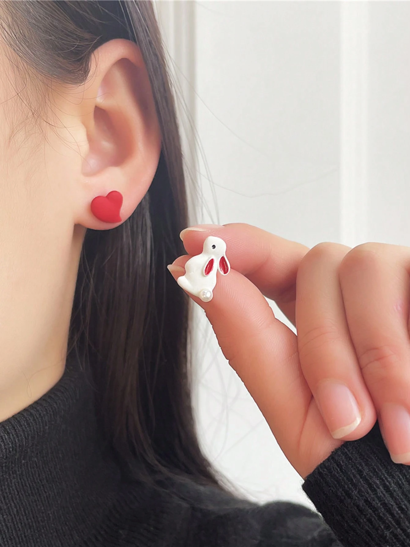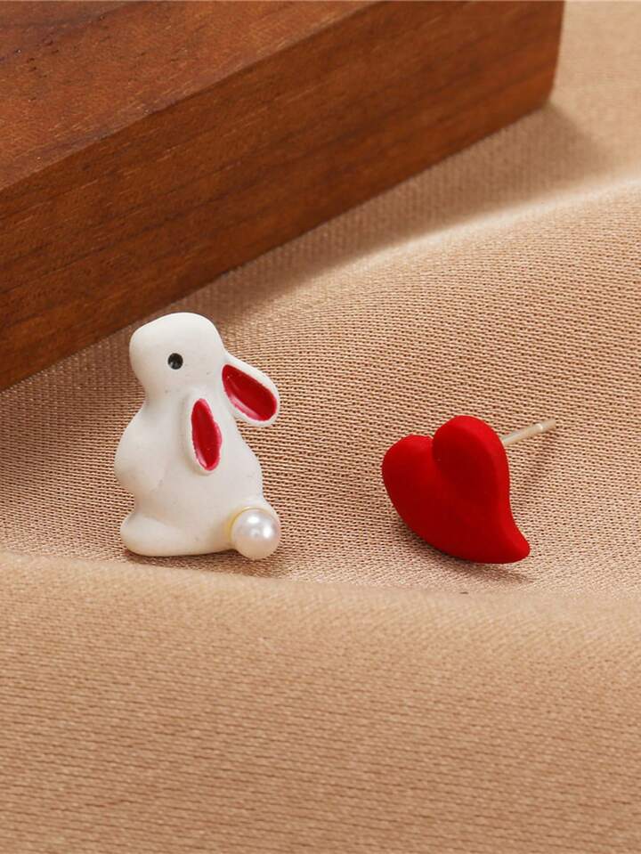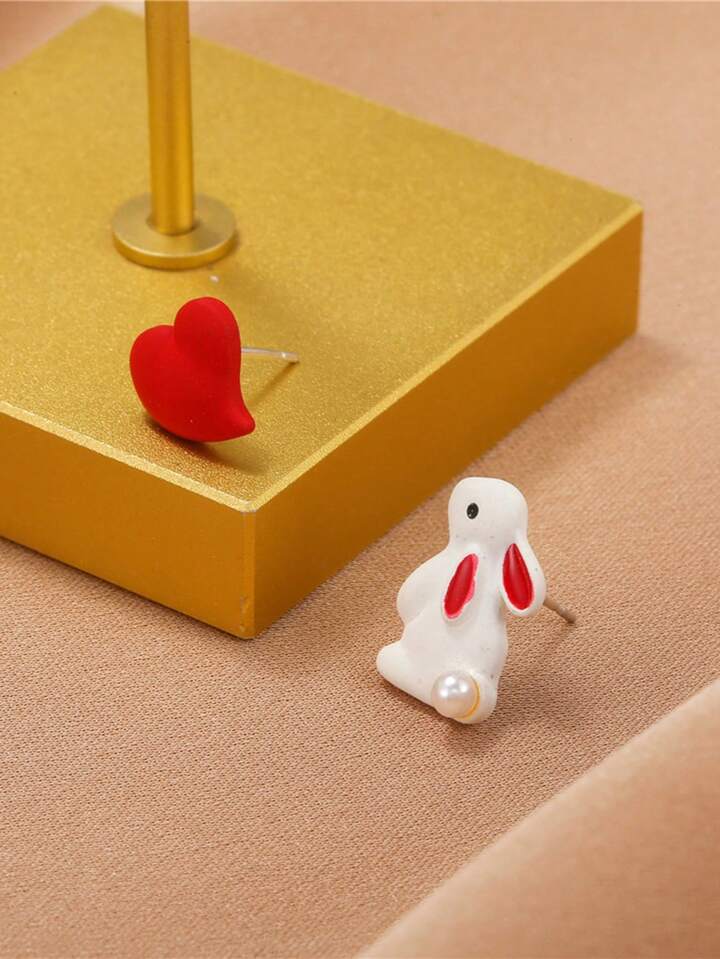 Kawaii 1pair Cute Iron Alloy Heart & Rabbit Decor Earrings For Women For Daily Decoration