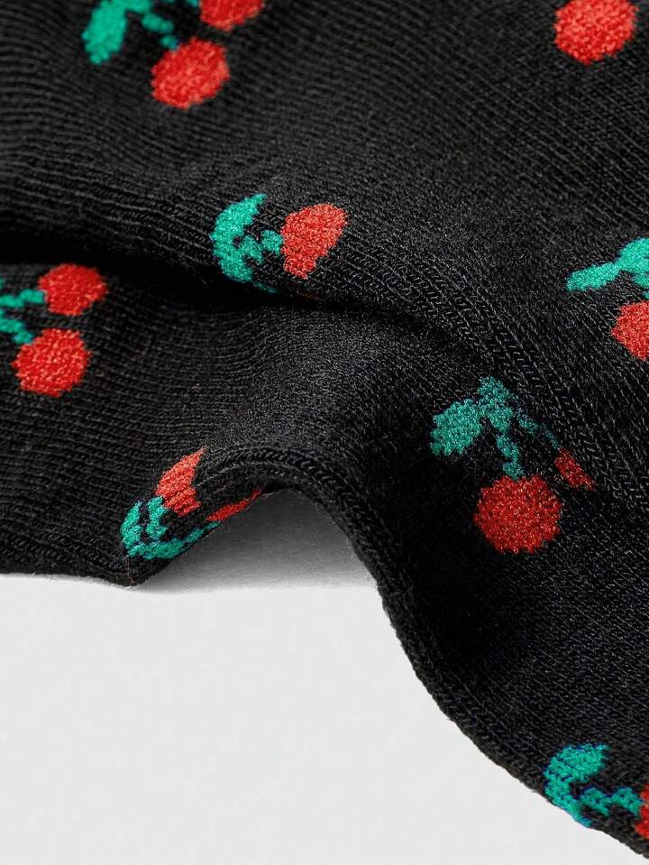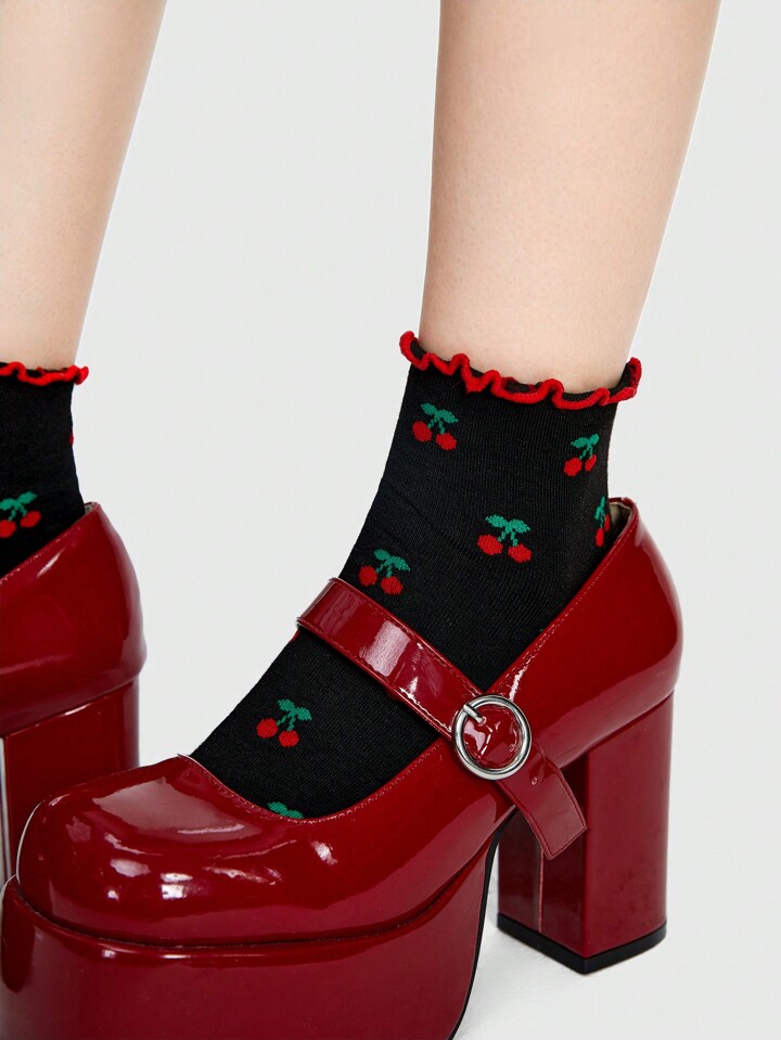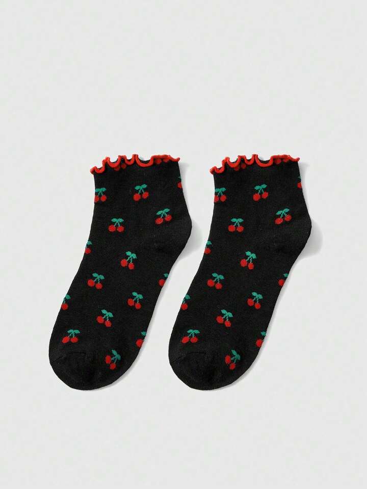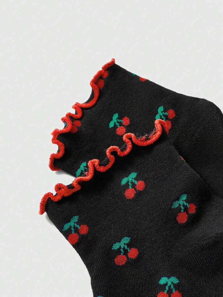 Kawaii 1pair Women Black Frill Trimmed Cherry Mid-Calf Socks, For All Seasons