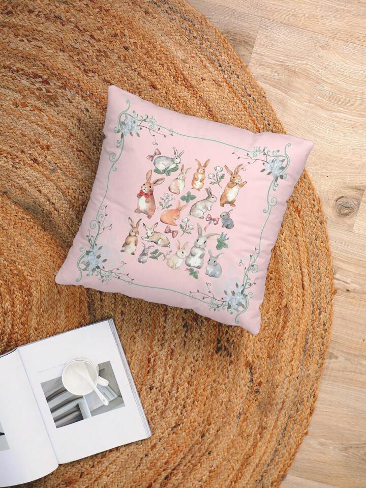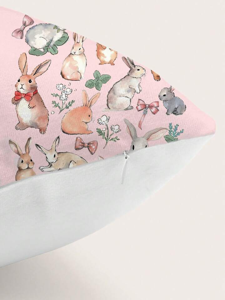 Kawaii 1pc Beautiful Pink Rabbit Butterfly Print Floral Pattern Pillowcase, No Pillow Core, Velvet Printed Square Throw Pillowcase, Suitable For Daily Living Room And Bedroom Decoration, Sofa Cushion Cover, Car Cushion Cover, All Seasons