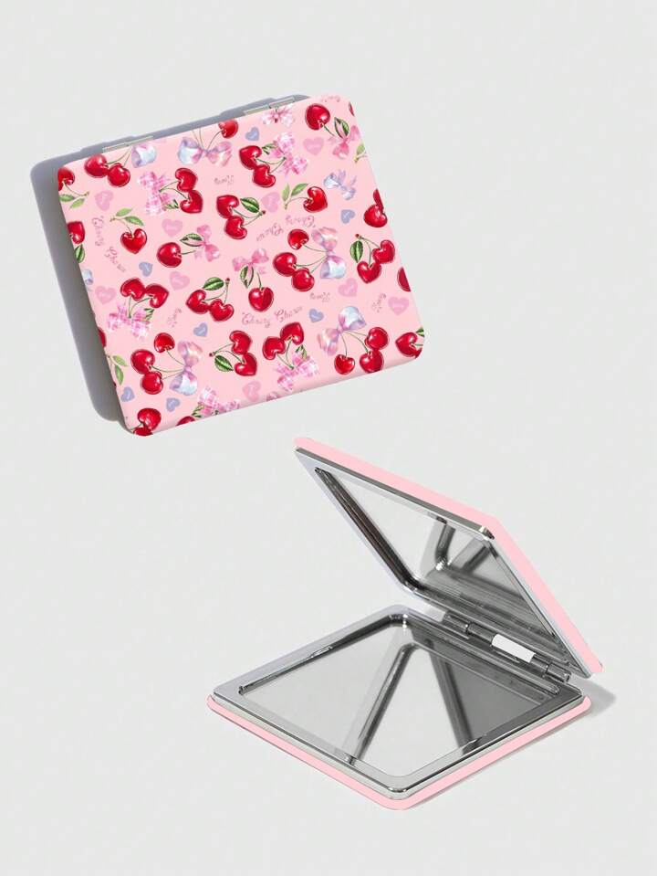 Kawaii 1pc Butterfly & Cherry Printed Square Makeup Pocket Mirror, Convenient For Girls To Touch Up, Floral Pattern Random