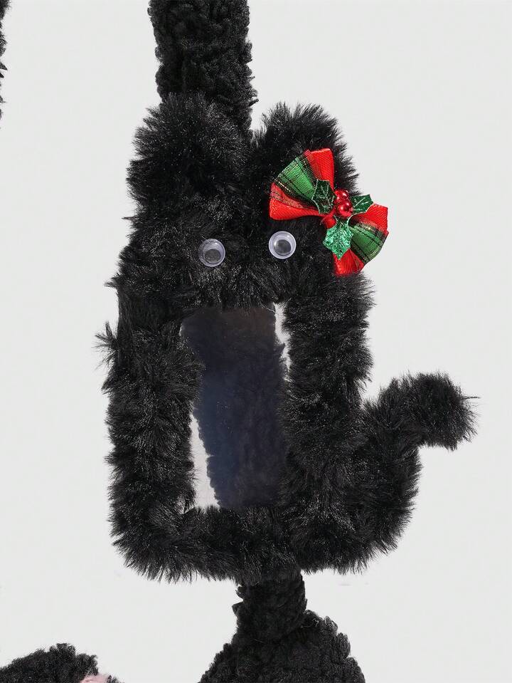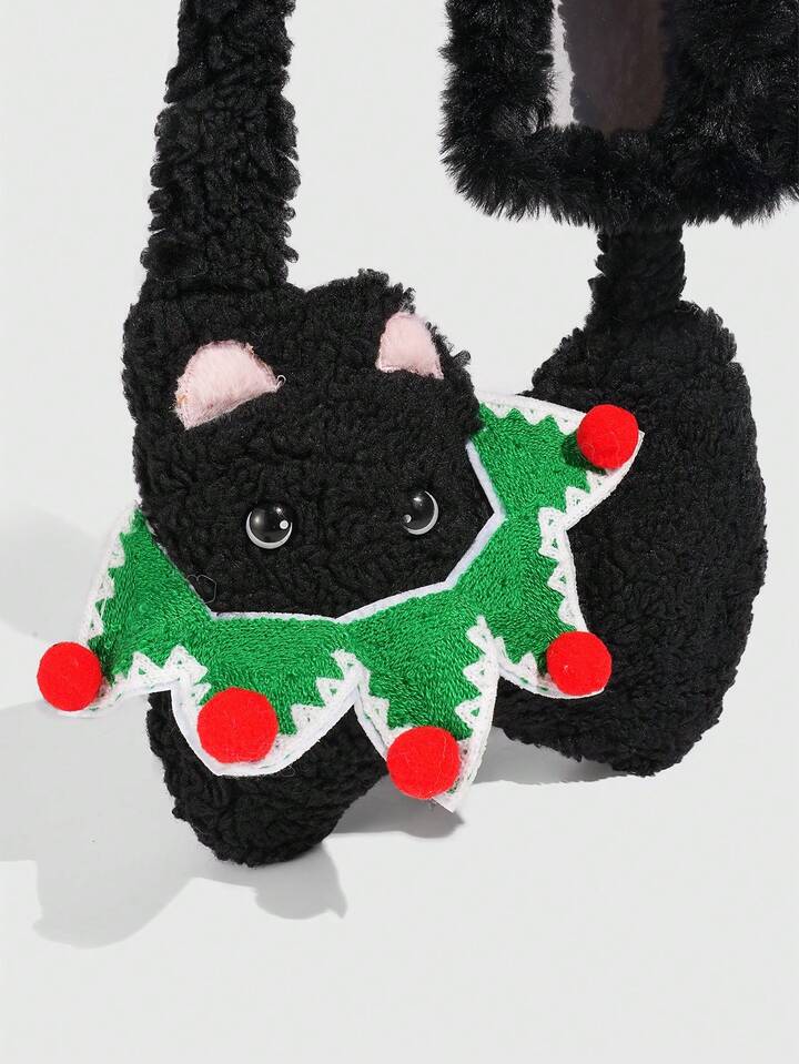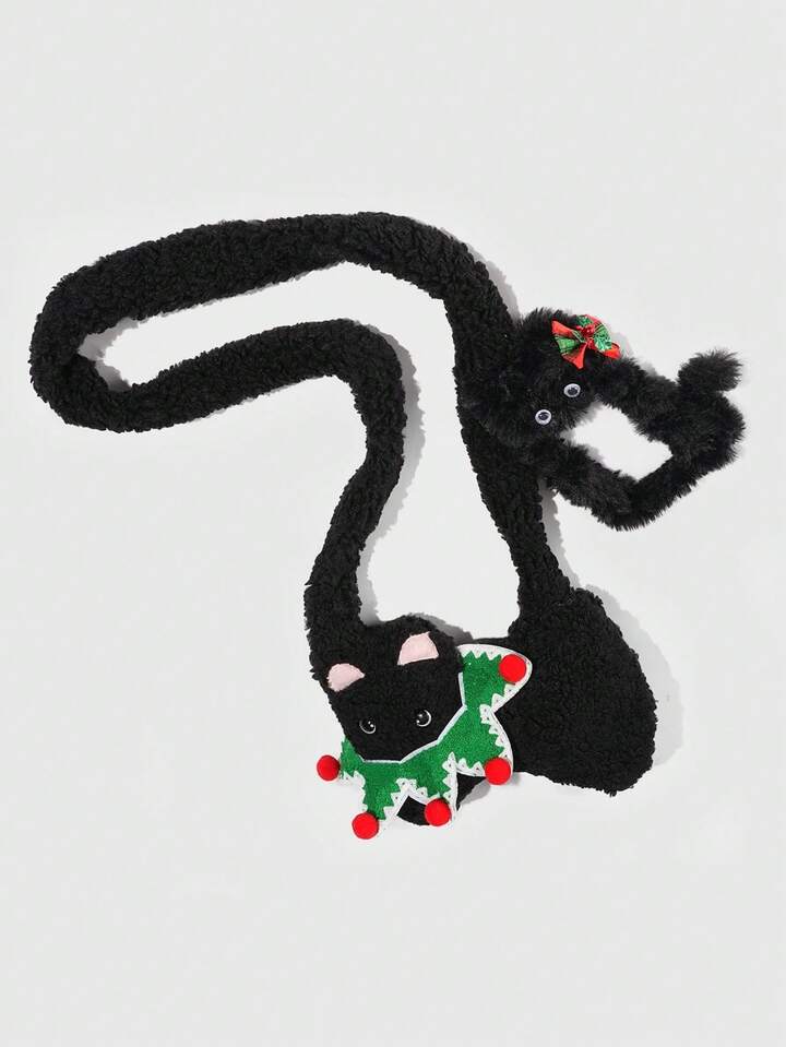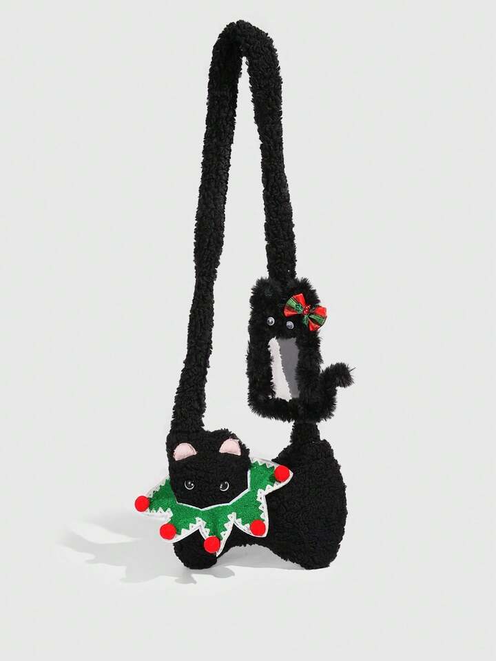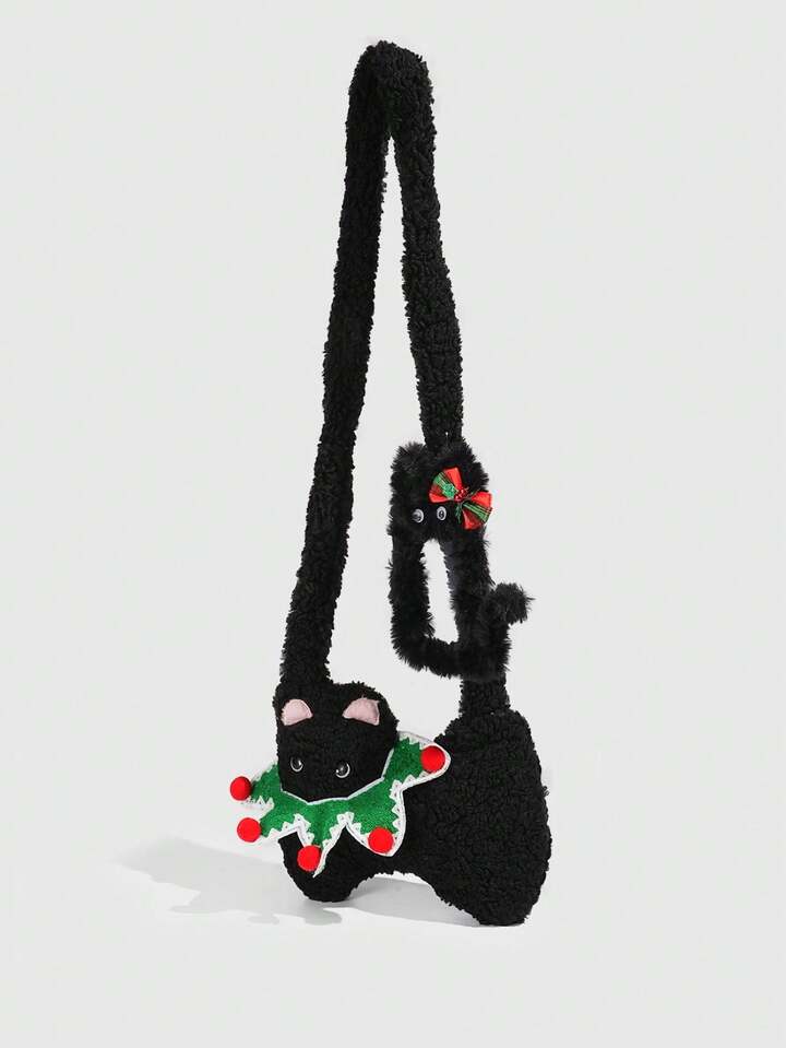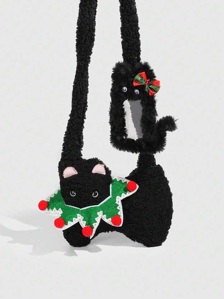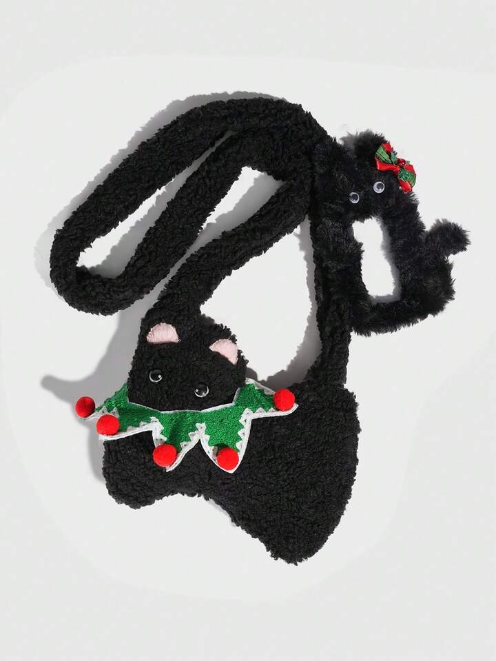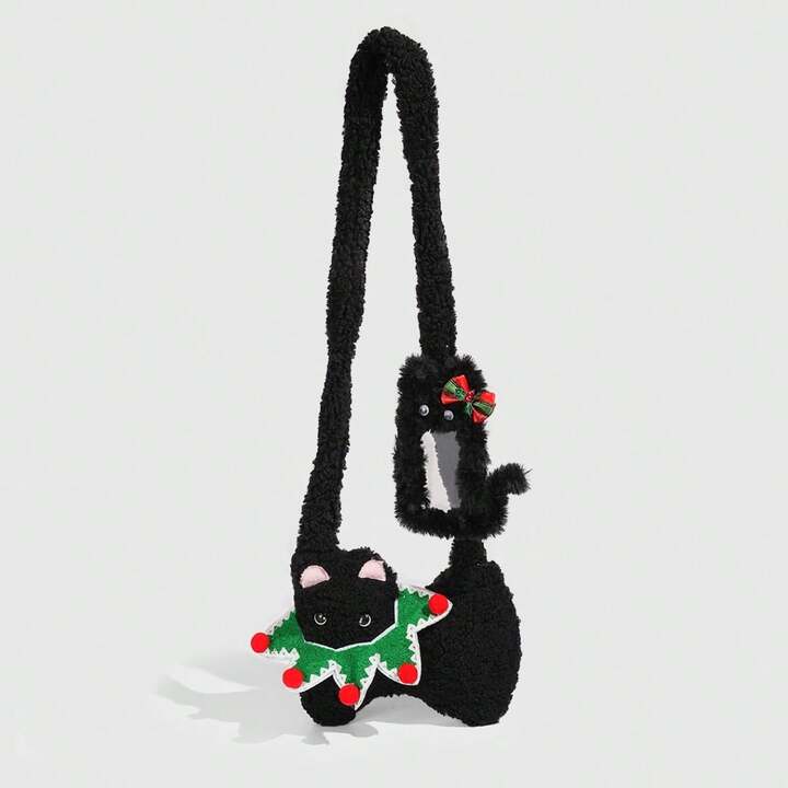 Kawaii 1pc Cute Black Plush Cat Bag In A Collegiate Style, A Christmas Autumn And Winter Cat Shoulder Bag, Paired With A Black Cat Christmas Bow Card Holder Single Strapmpit Bag
