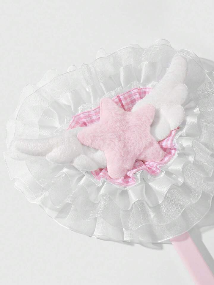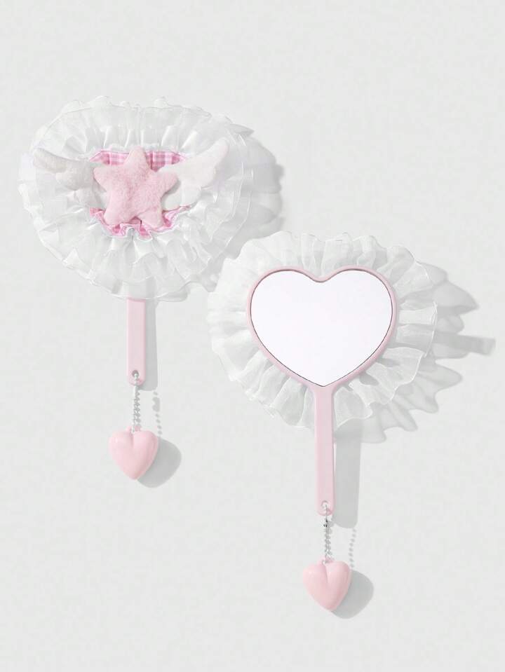Kawaii 1pc Cute Cartoon Princess Style Pink & White Plaid Mesh Ruffle Wing Star Acrylic Heart-Shaped Handheld Makeup Mirror, Suitable For Women/Girls Daily Use, Holiday Gift