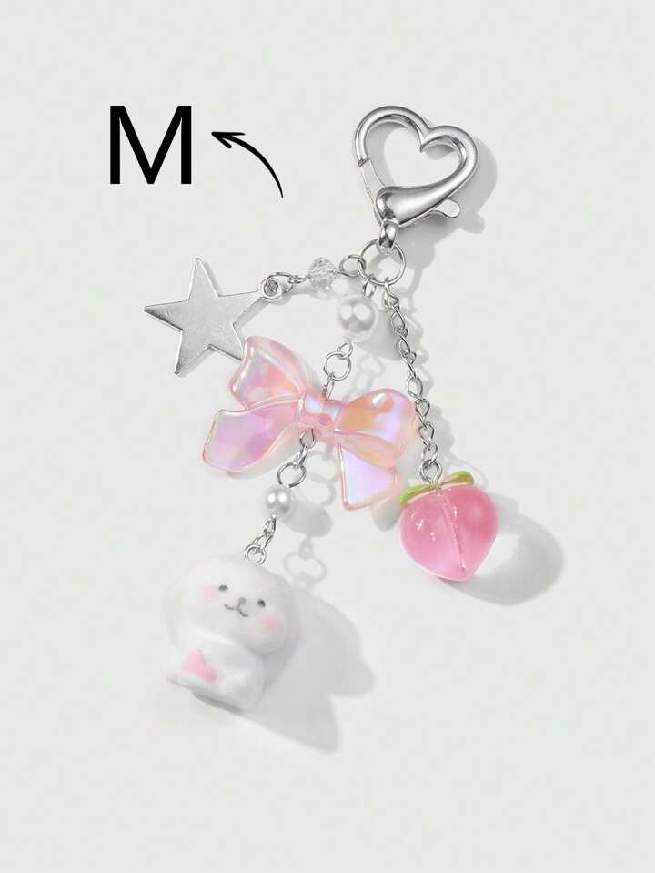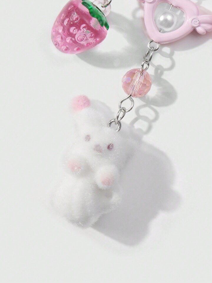 Kawaii 1pc Cute Cartoon Sweet Versatile College Style Silver Tone Chain Link Faux Pearl Strawberry Peach Bow Wings Heart Shaped Flocked Rabbit/Dog/Bear Pendant Keychain Bag Charm, Suitable For Women & Girls, Holiday Gift