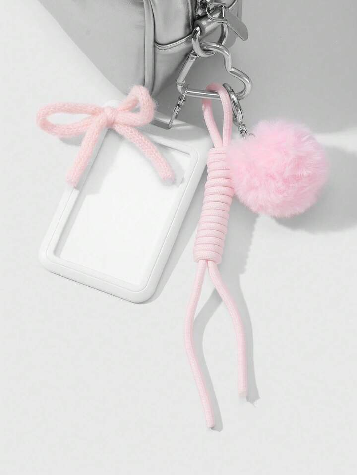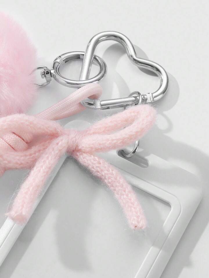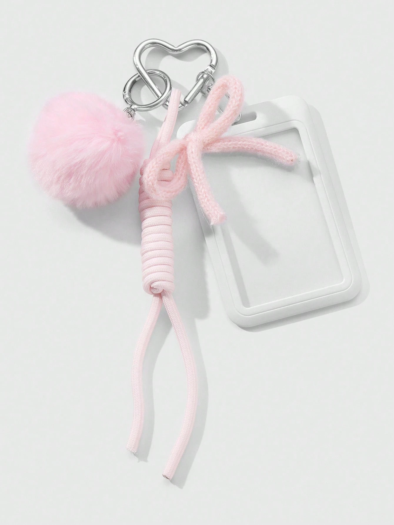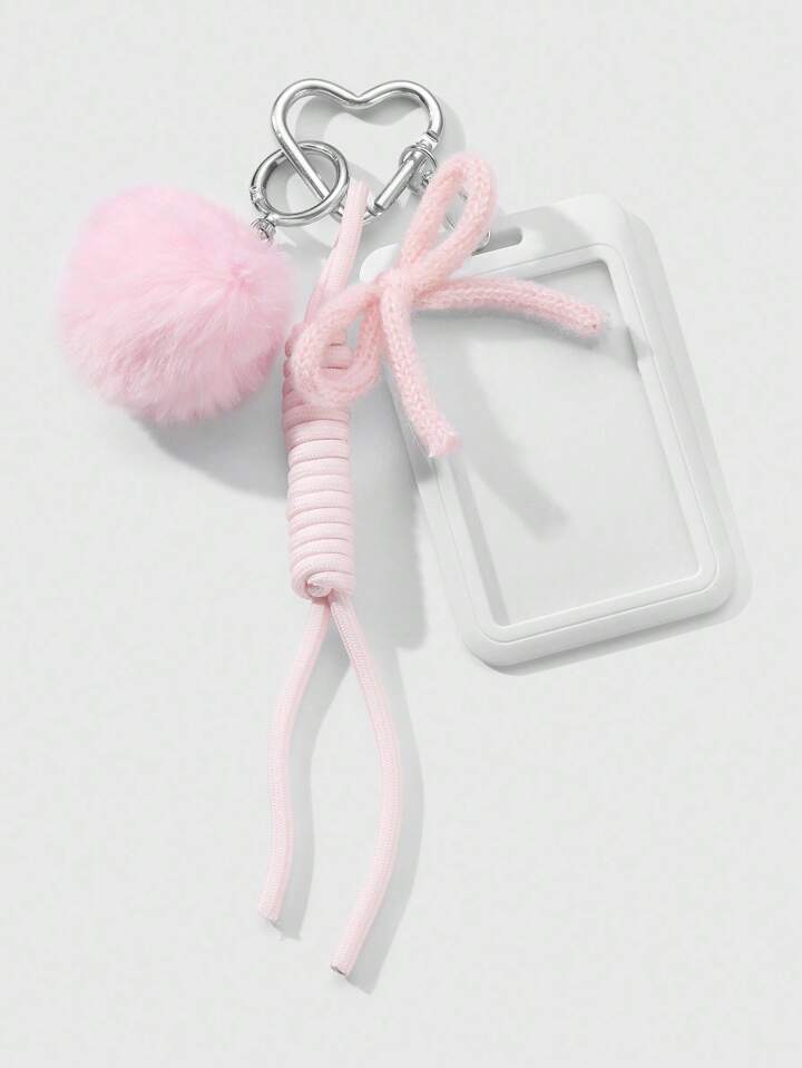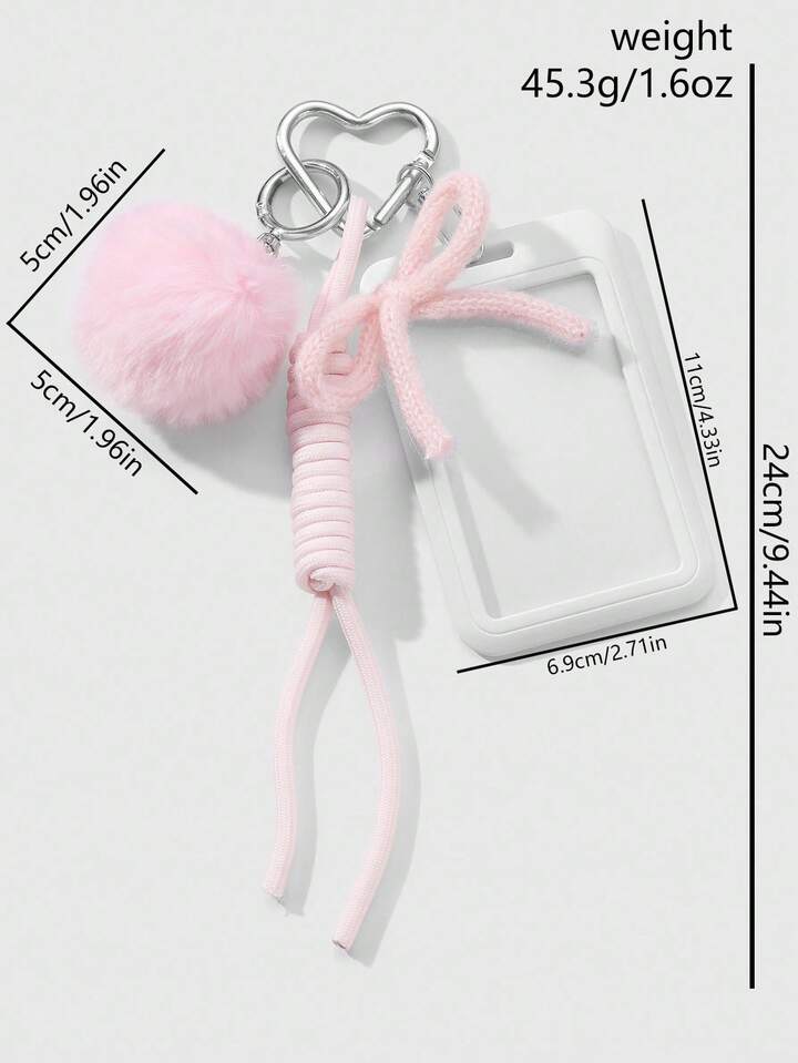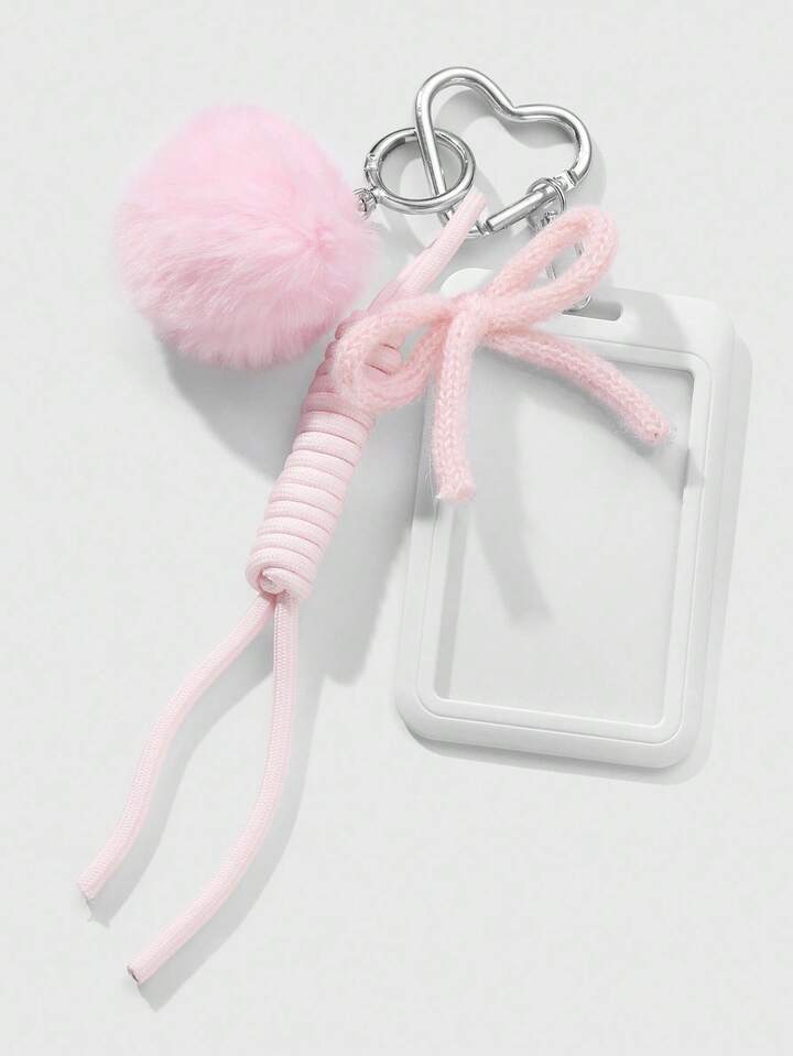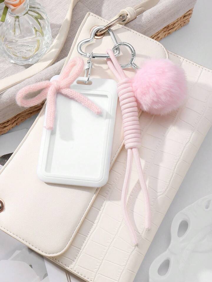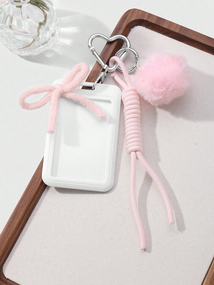 Kawaii 1pc Cute Minimalist Fashion High-Quality Pink Plush Ball Bow Adjustable Braided Rope Acrylic Campus Card/ID Badge Holder DIY Keychain Bag Charm, Suitable For Office Workers, Students, Daily Wear, Holiday Gift