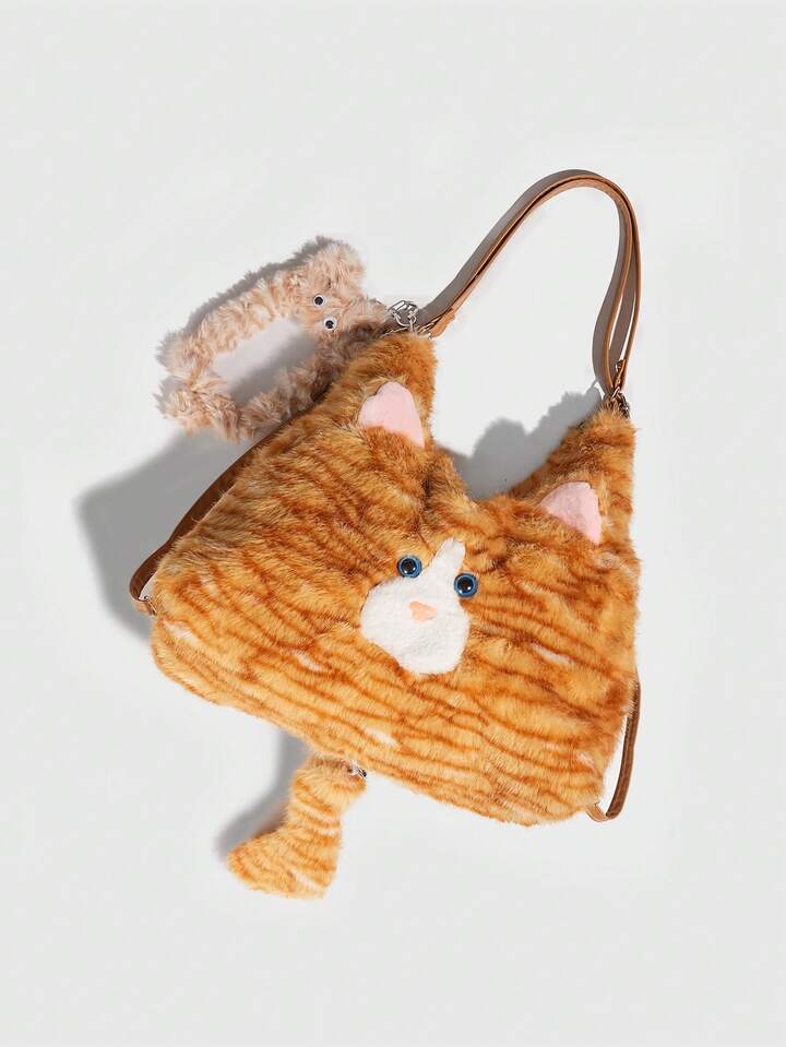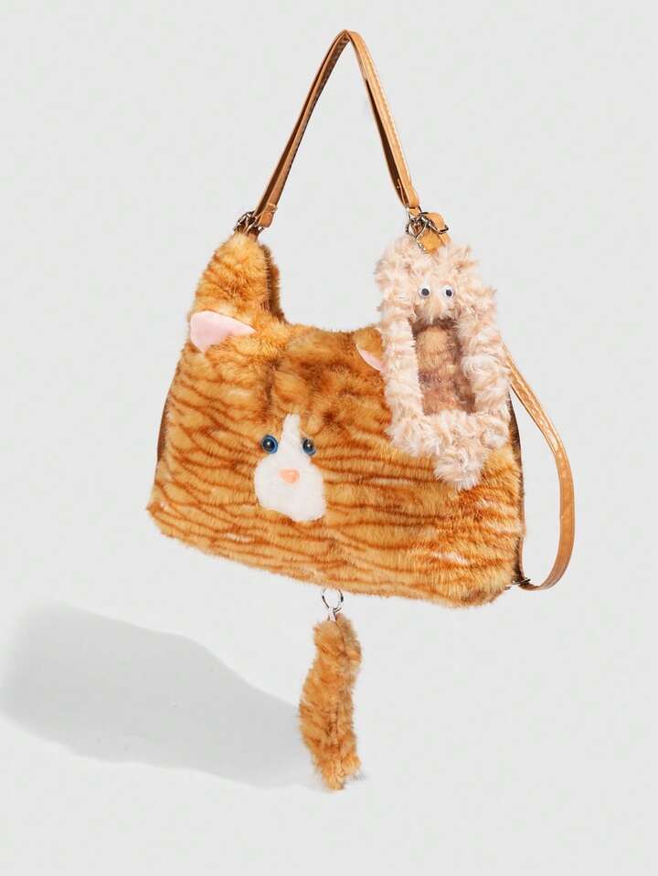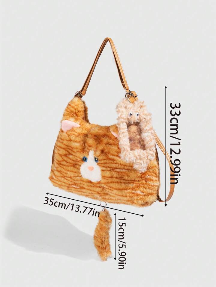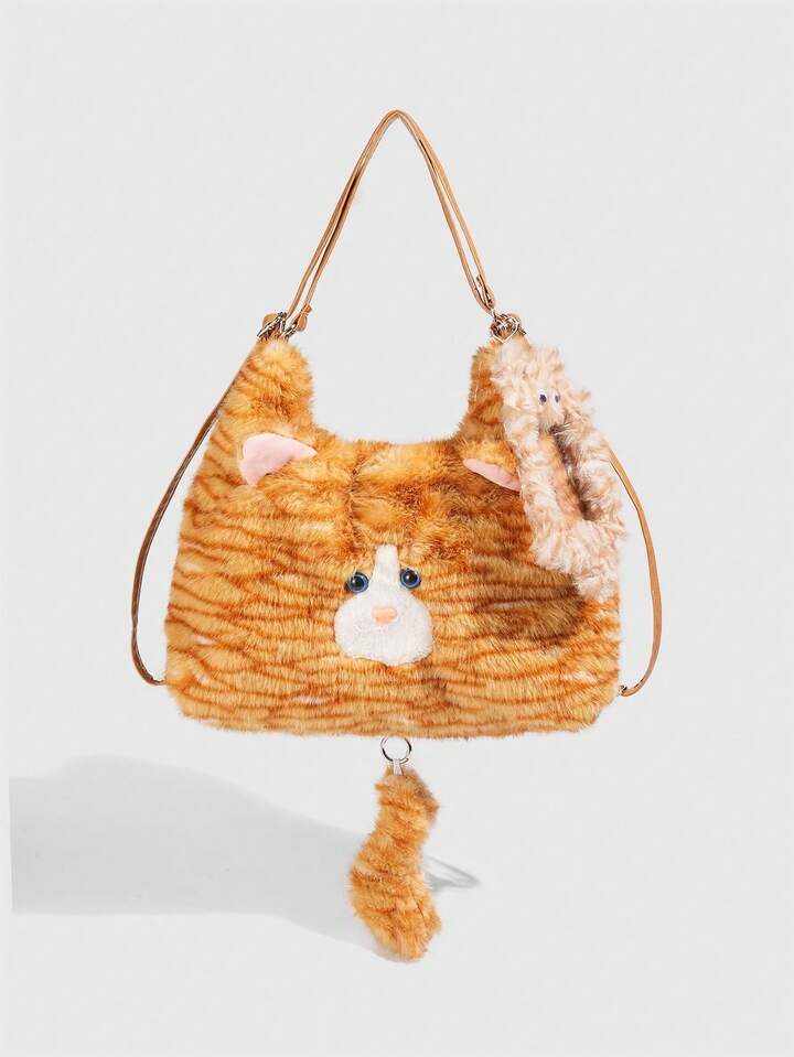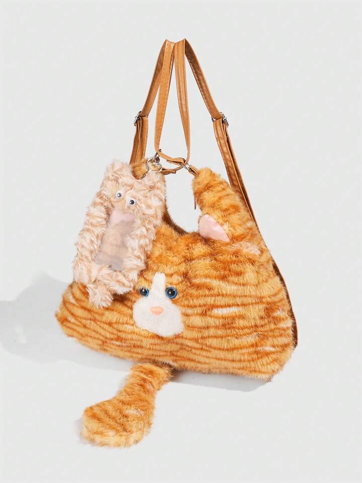 Kawaii 1pc Cute Yellow Plush Cat In A College Style, A Long Tail Cat Armpit Bag, A Large Capacity Commuting Tote Bag For Daily Use In Autumn And, A Small Cat Card Sleeve To Match The Backpack