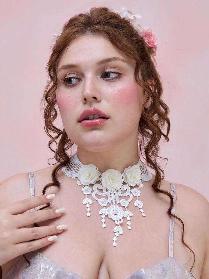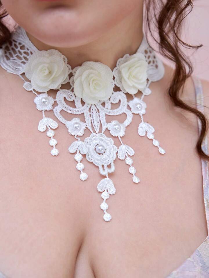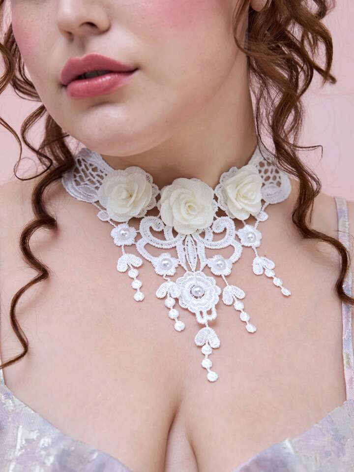 Kawaii 1pc Elegant Palace Style Rose Lace & Pearl Decor Pendant Necklace, High-Quality Charming Retro Lace Beads Choker Necklace, Unique Design Versatile Accessory