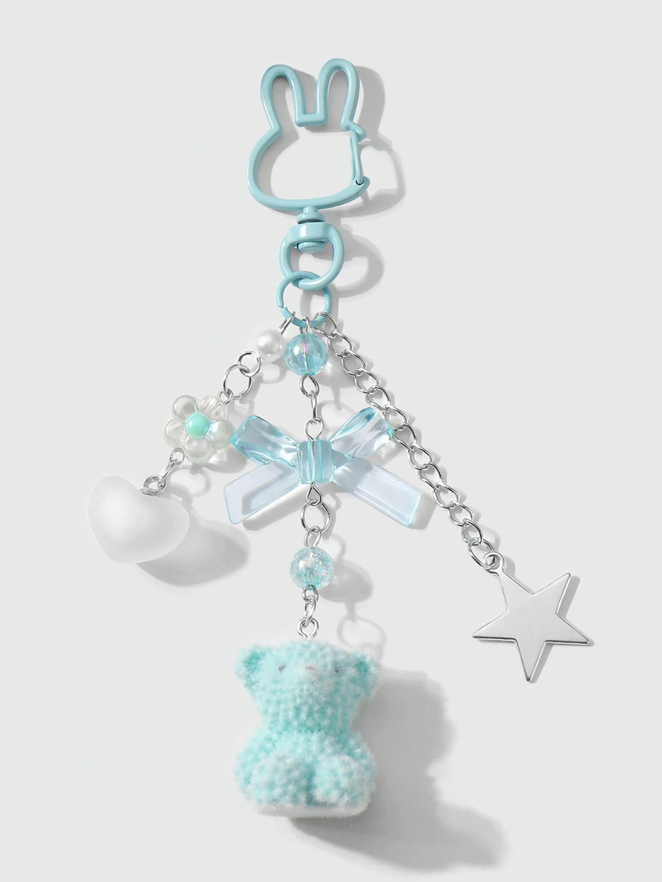Kawaii 1pc Fashionable Cute Textured Metallic Silver Star, Heart, Bow Pendant Keychain With Faux Crystal Teddy Bear Charm, Versatile Accessory For Girls/Women, Ideal Gift