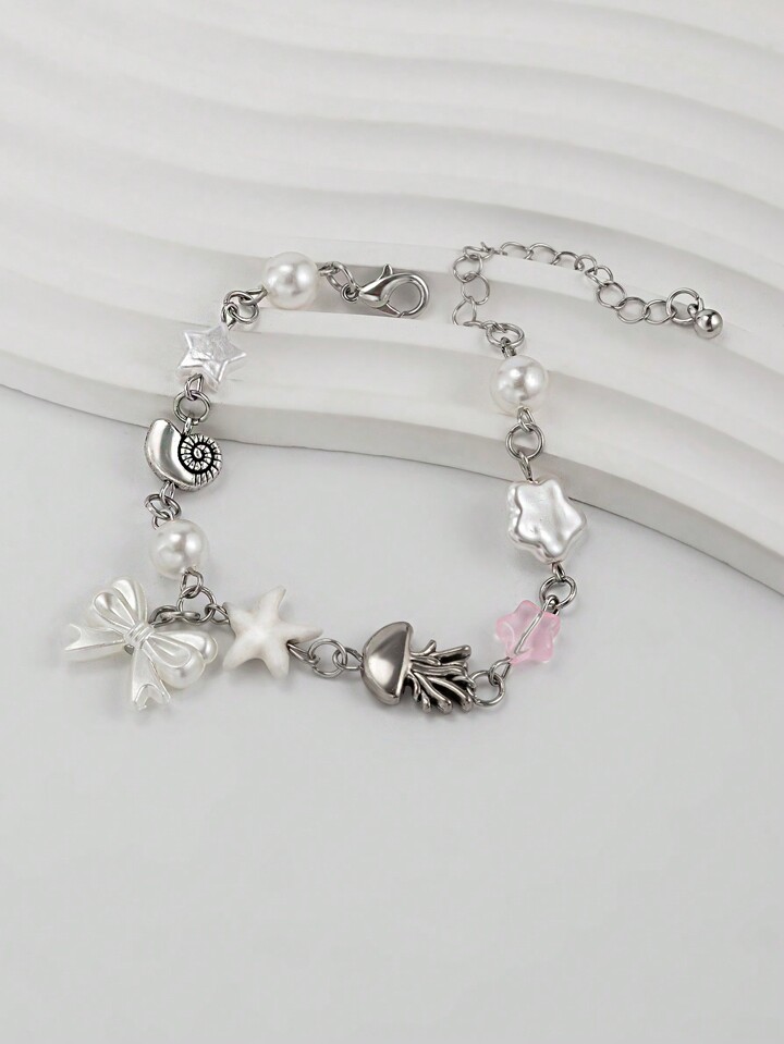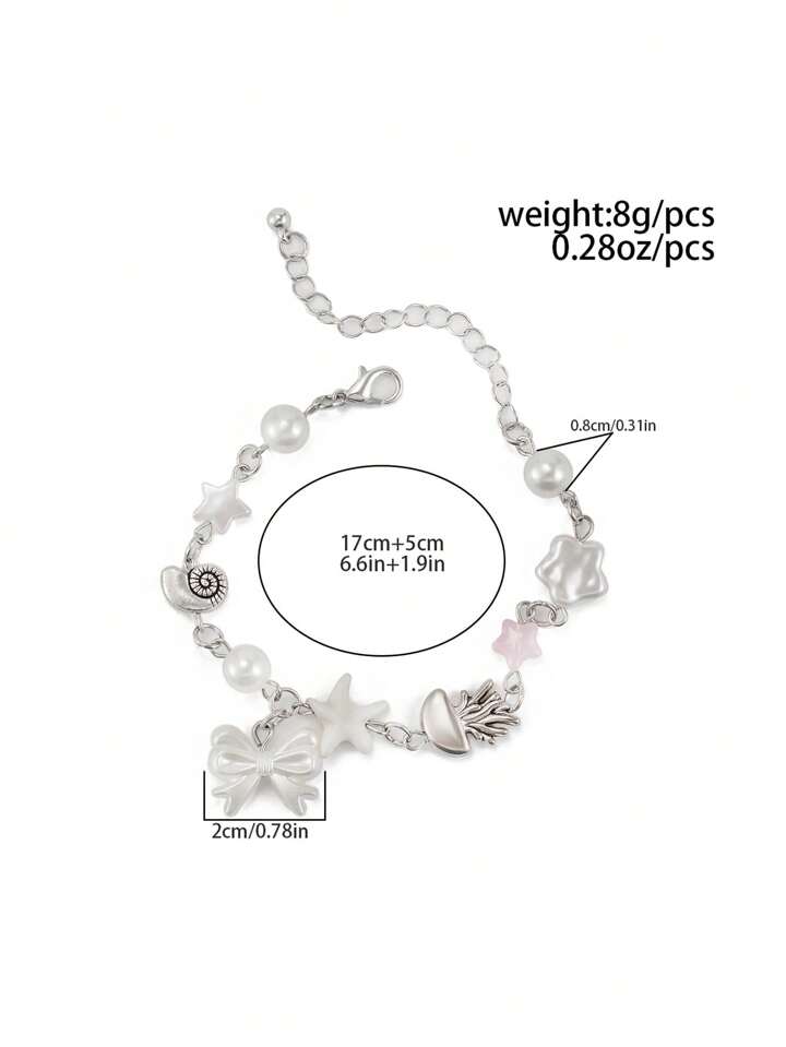 Kawaii 1pc Fashionable Sweet And Simple Starfish Shell Pendant Faux Pearl Chain Bracelet With Bowknot And Butterfly Valentines,Mom,Mother,Mother's Day,Gift