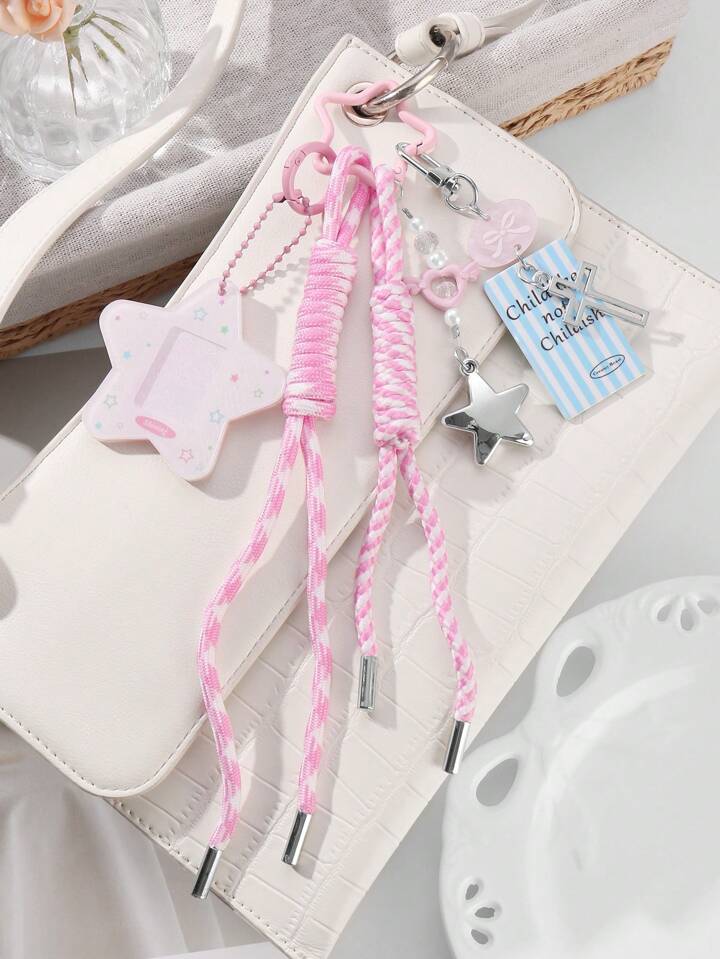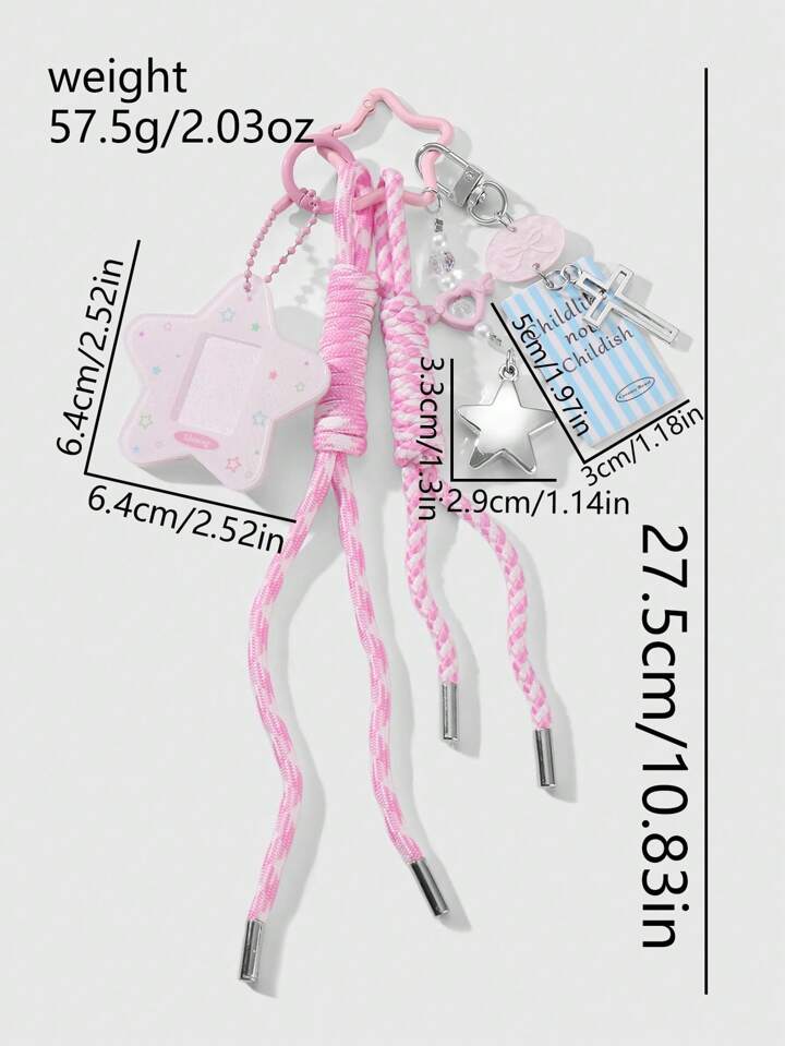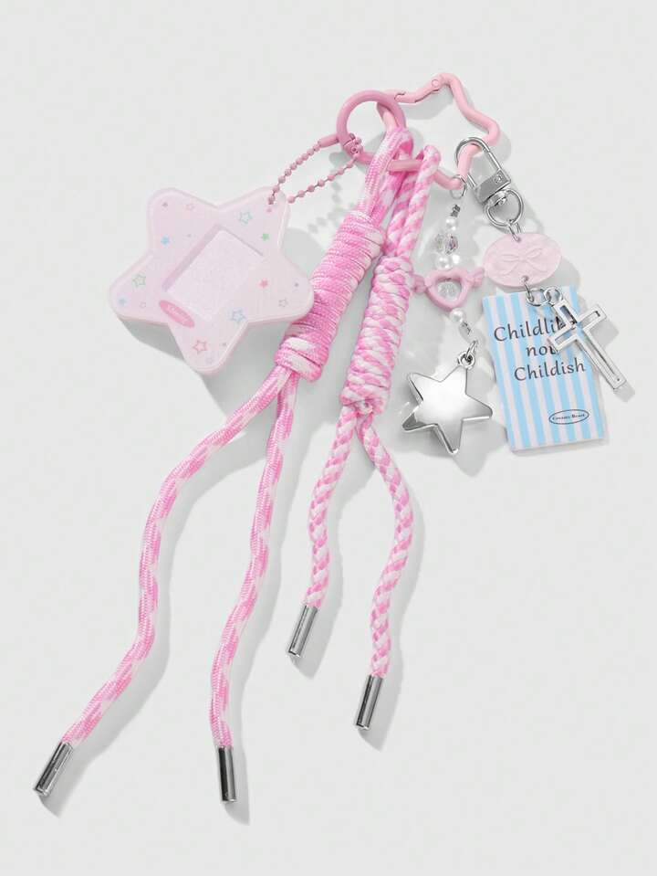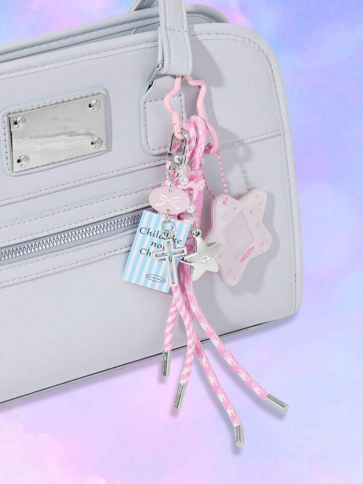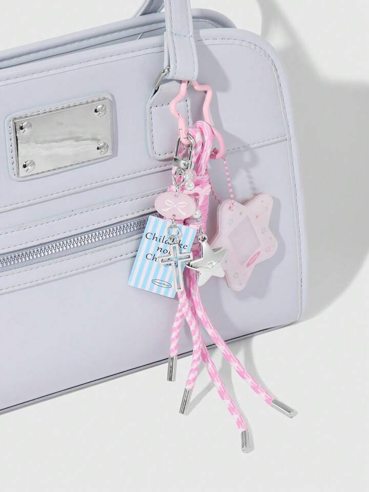Kawaii 1pc Fashionable Versatile Sweet High-Quality Pink Beaded Acrylic Faux Diamond Star Frame ID Card Photo Butterfly Cross DIY Keychain Pendant Charm Suitable For Women, Girls Daily Wear, Holiday Gift